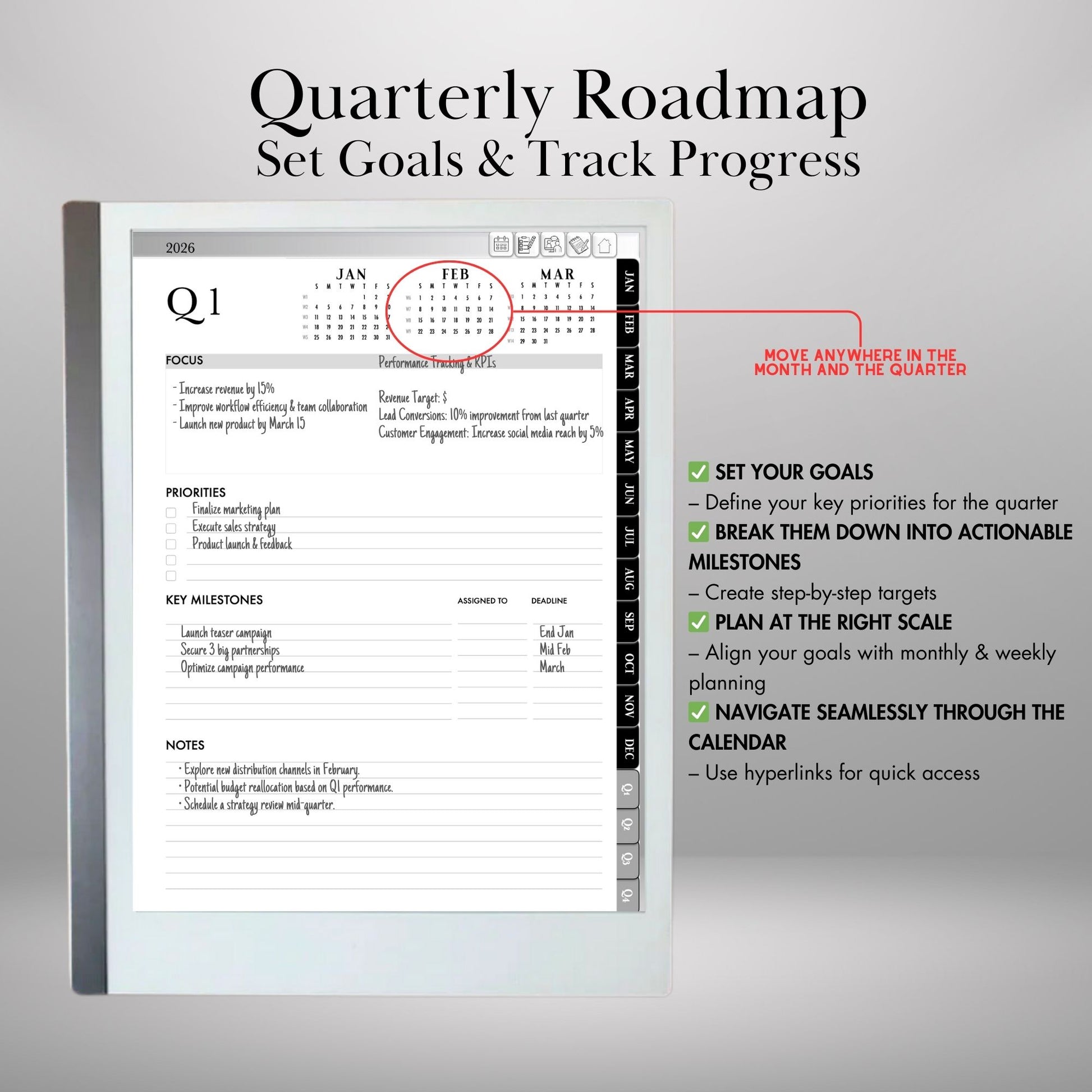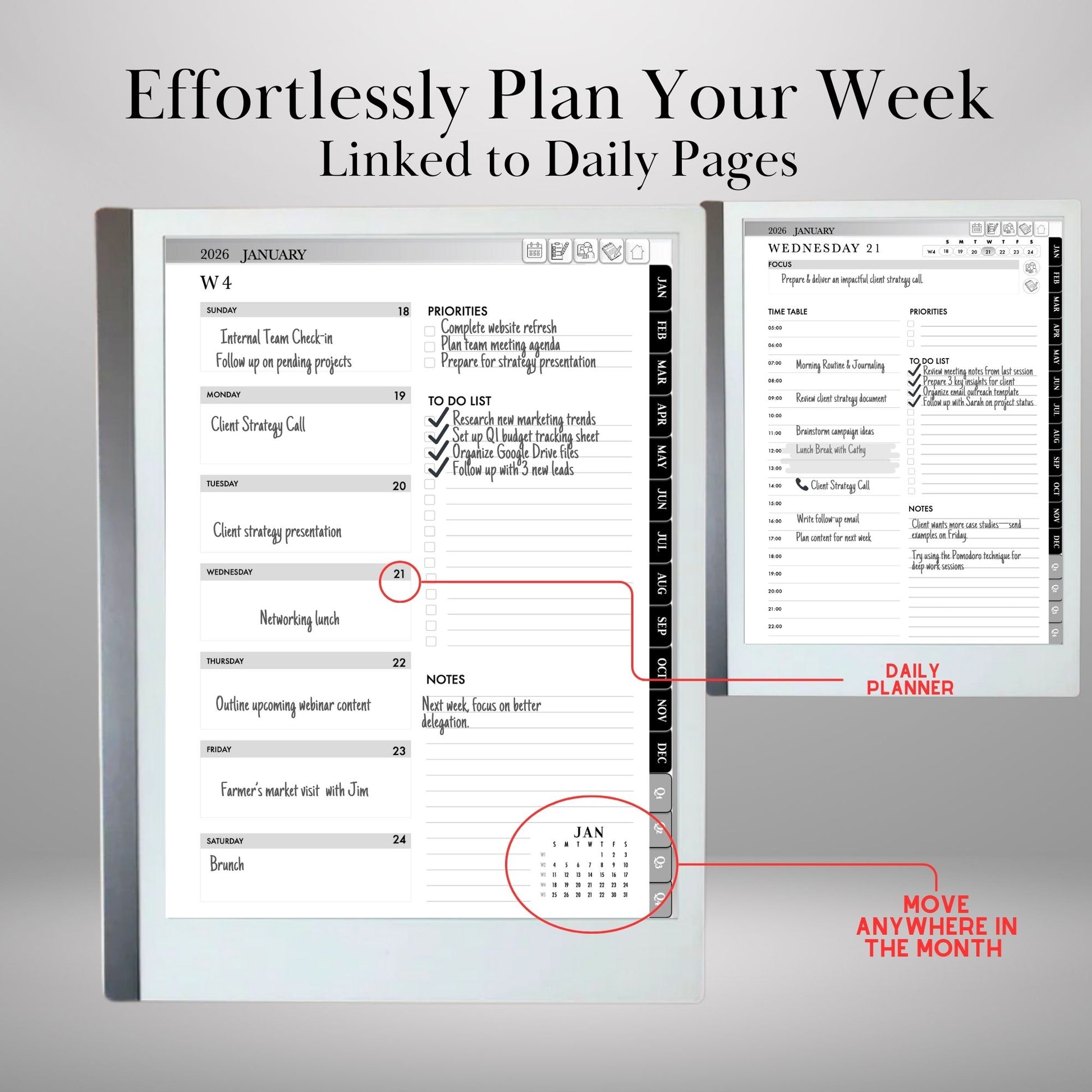 Plan smarter and stay organized in 2026 with this sleek, fully hyperlinked digital planner—designed exclusively for the reMarkable Paper Pro and reMarkable 2 tablets. With daily meeting notes, structured task management, and instant navigation between pages, this planner is the ultimate tool for professionals, entrepreneurs, and productivity enthusiasts.