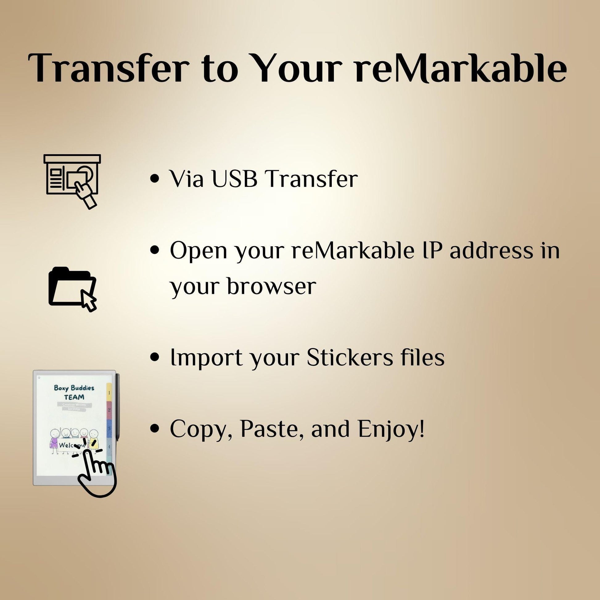 ✨ WHAT’S INCLUDED ✔ Copy-Paste Stickers (native remarkable file .rmdoc) – Fun “Boxy Buddies” in expressive poses & doodle themes ✔ Pre-Cropped for Instant Use – No tracing required, just copy & paste into your pages ✔ Hyperlinked Sticker Notebook – Indexed tabs for quick navigation ✔ Right- & Left-Handed Versions – Optimized layouts for easy use ✔ Color & Grayscale Friendly – Crisp and clean on all eInk displays
