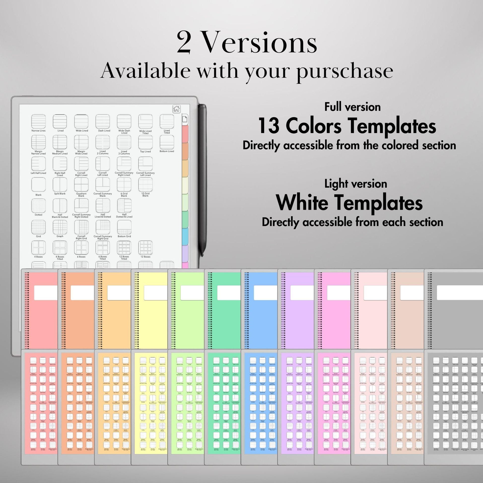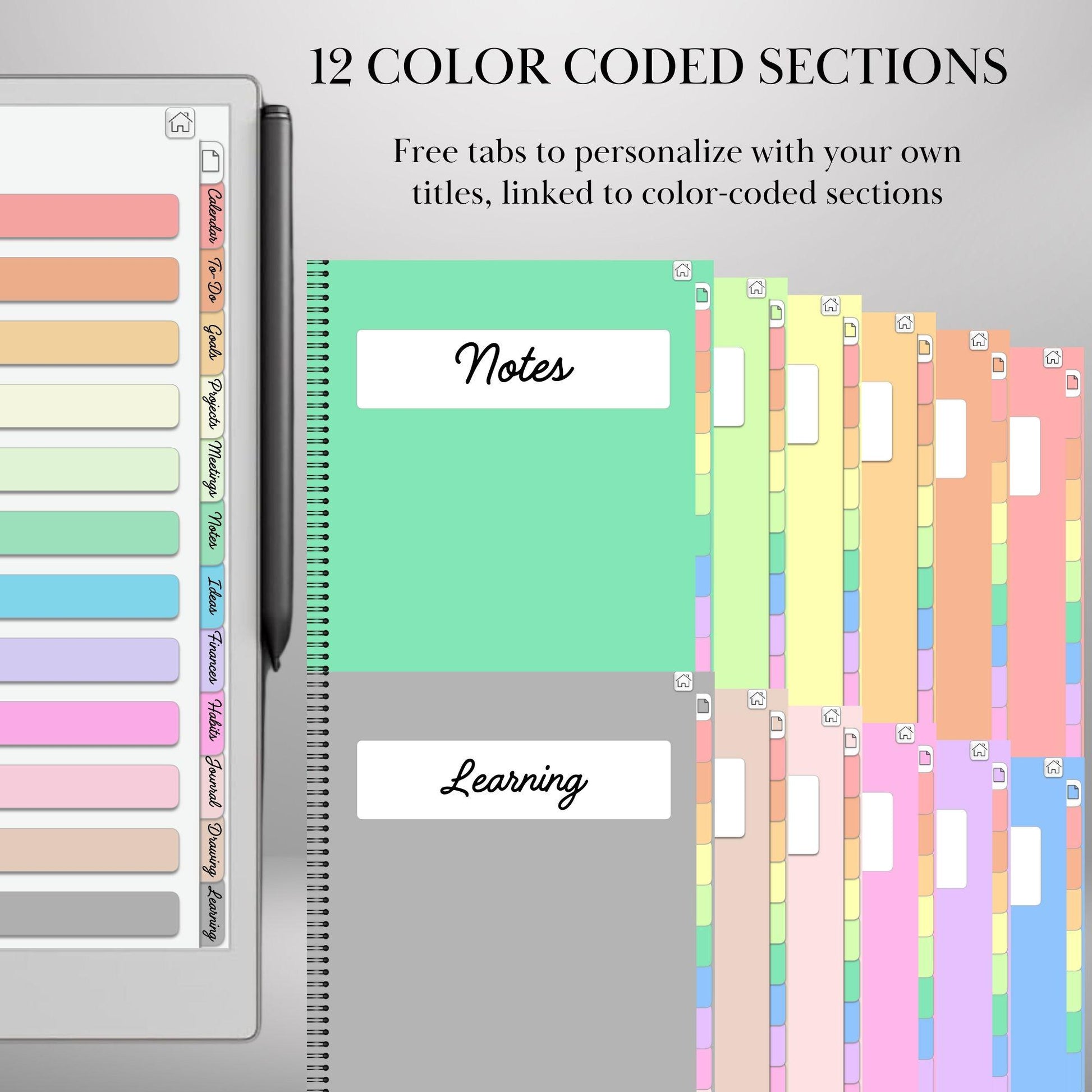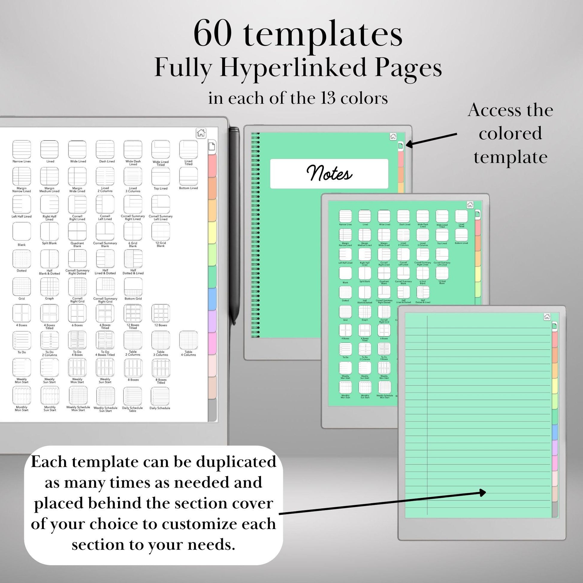 Enhance your digital note-taking with this highly customizable, hyperlinked notebook, designed specifically for reMarkable Paper Pro & reMarkable 2. Featuring 12 colored sections and 60 template options, this digital notebook allows you to personalize every aspect of your notes. Whether you’re a professional, student, writer, or creative thinker, this structured and easy-to-navigate notebook will help you stay organized and productive.