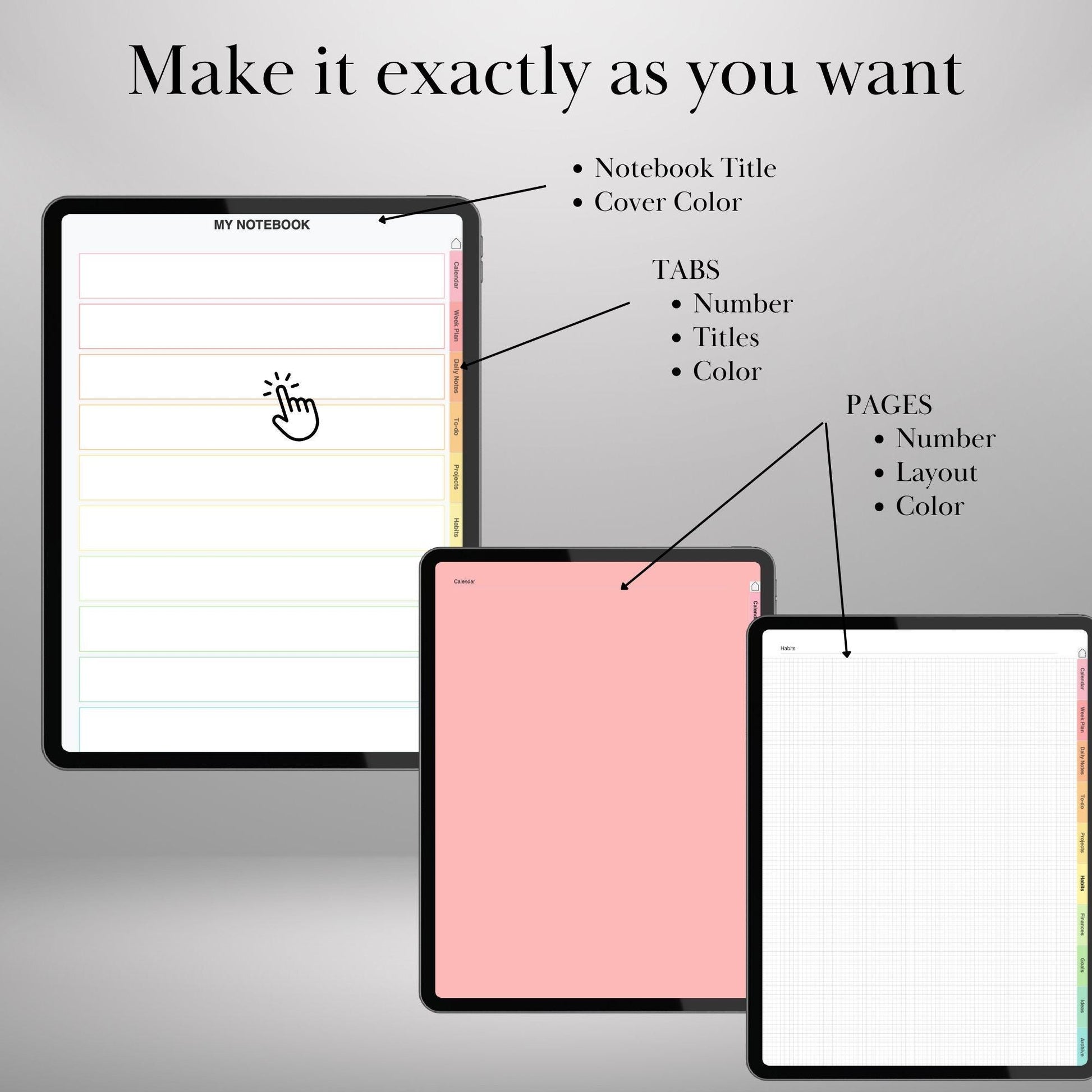📓 DIGITAL DOWNLOAD – Create Your Perfect Digital Notebook in 1 Minute Design your ideal hyperlinked notebook—exactly how you want it—using this simple Custom Notebook Creator. Made for Goodnotes, Notability, Noteshelf, Samsung Notes, Xodo, and all PDF note-taking apps, this tool lets you generate a fully personalized notebook in seconds: choose your tabs, titles, colors, page styles, number of pages, and orientation… then export a fresh hyperlinked PDF whenever you want.
