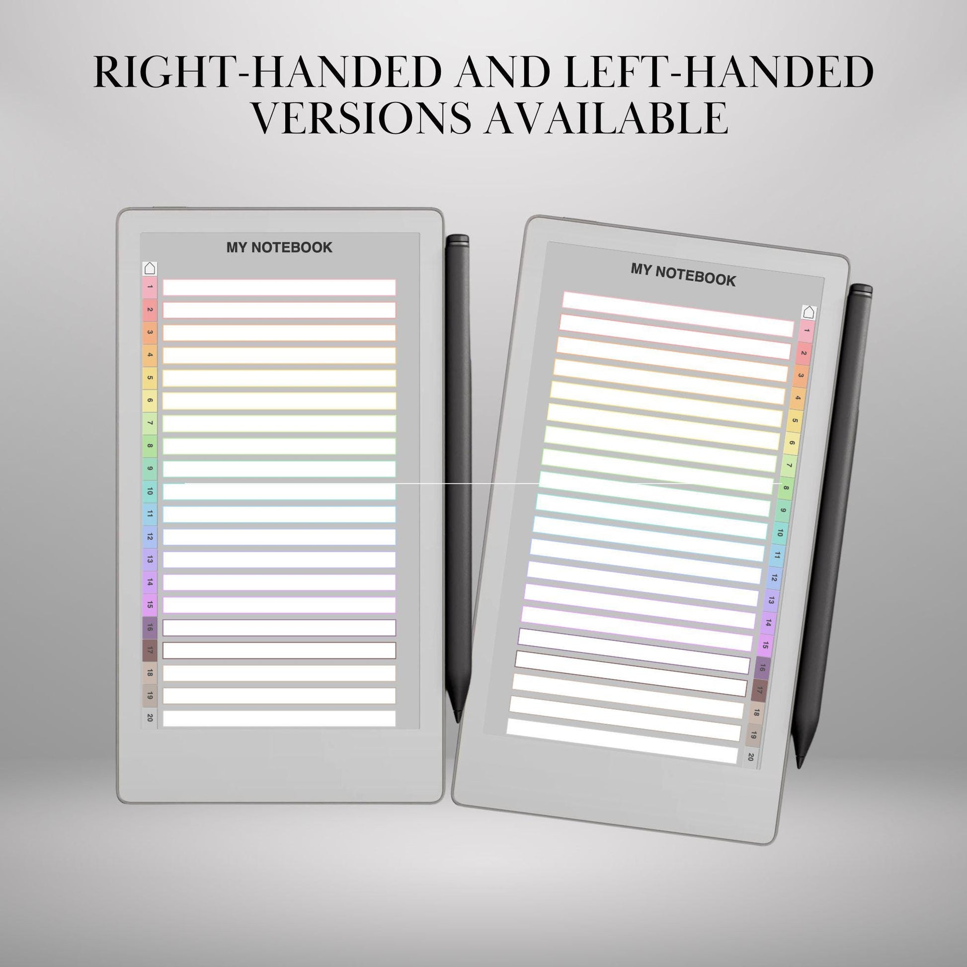 ✨ WHAT YOU CAN CUSTOMIZE 🔖 Tabs & Structure (2 Levels!) Build a true “second brain” with: • Number of main sections • Sub-sections per section • Custom titles for every tab • Tab colors (soft pastels, bold tones, gray tones, or your own palette) • Two tab levels = faster navigation & better organization • Tab position: right or left side for Right-handed & left-handed versions • Portrait (vertical) and Landscape (horizontal) format