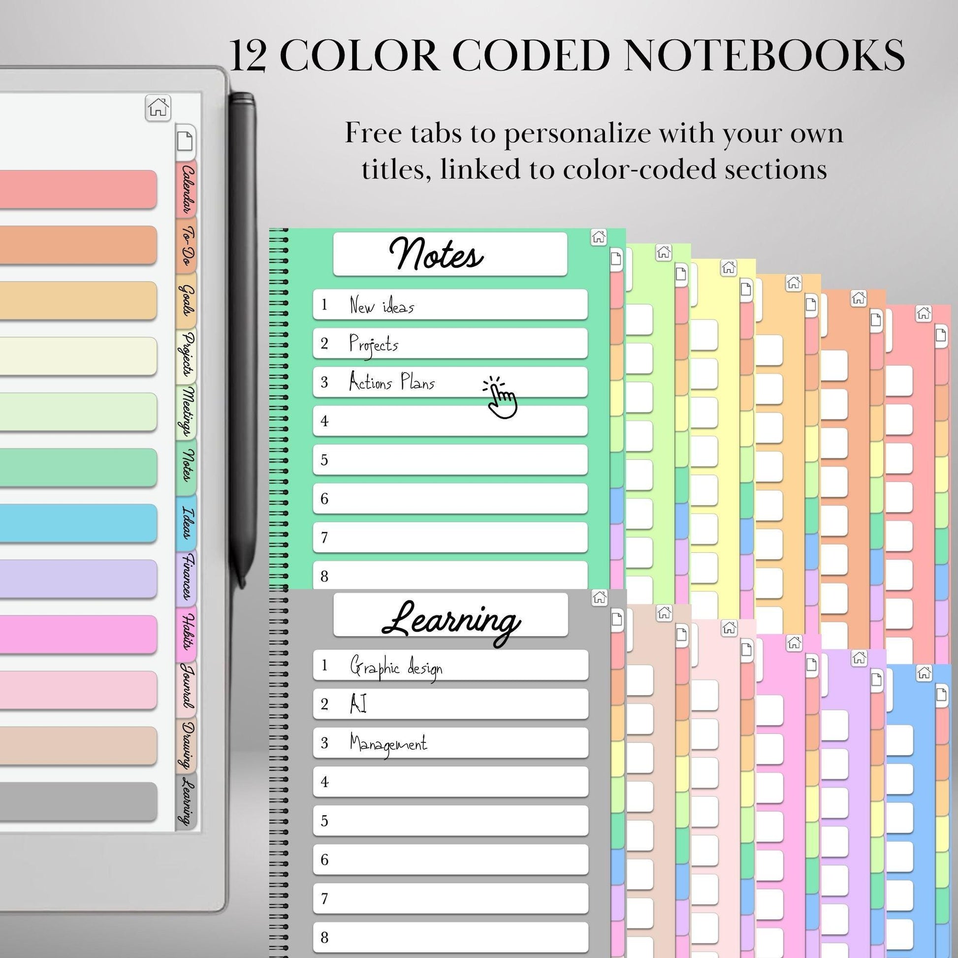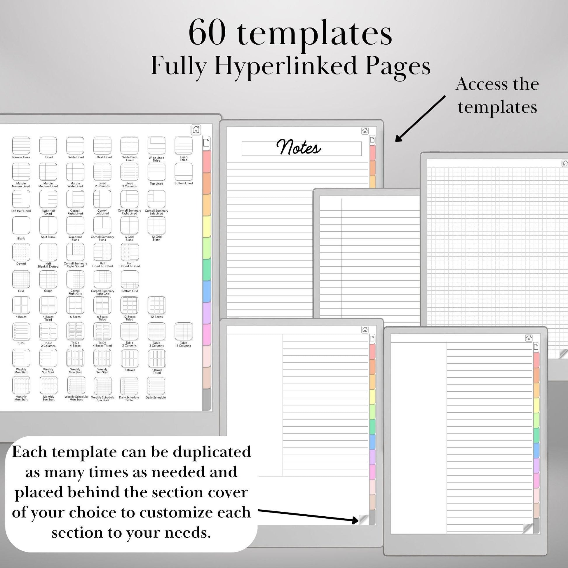 Elevate your digital organization with this clean and minimalist hyperlinked notebook—perfectly designed for reMarkable Paper Pro and reMarkable 2. Featuring 12 fully hyperlinked colored sections, each with 10 customizable subsections, and 60 versatile templates, this notebook provides a distraction-free and endlessly duplicable workspace for professionals, students, writers, and creatives alike.