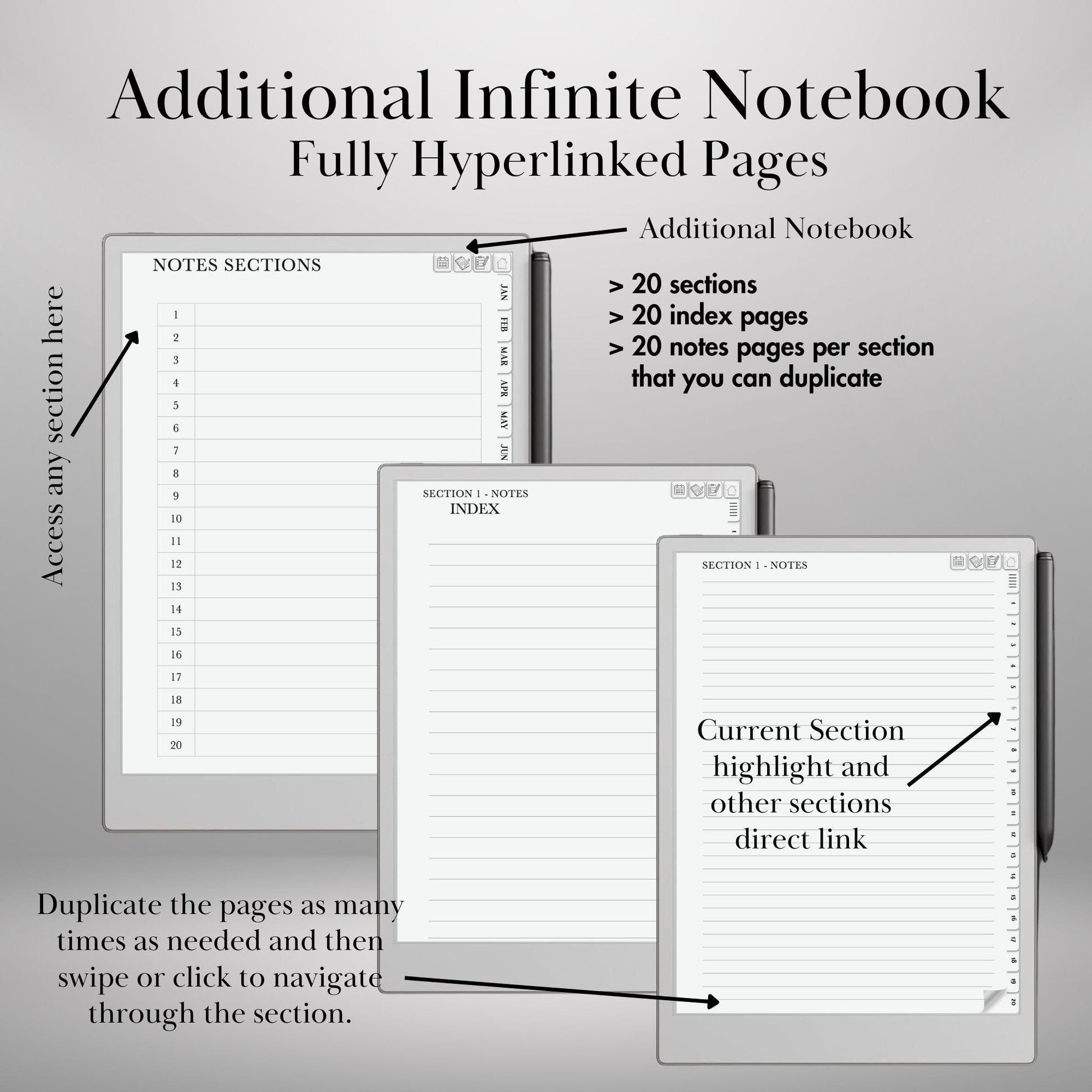 ✅ Infinite Notebook System – 20 sections with 20 pages each, fully expandable for unlimited notes.