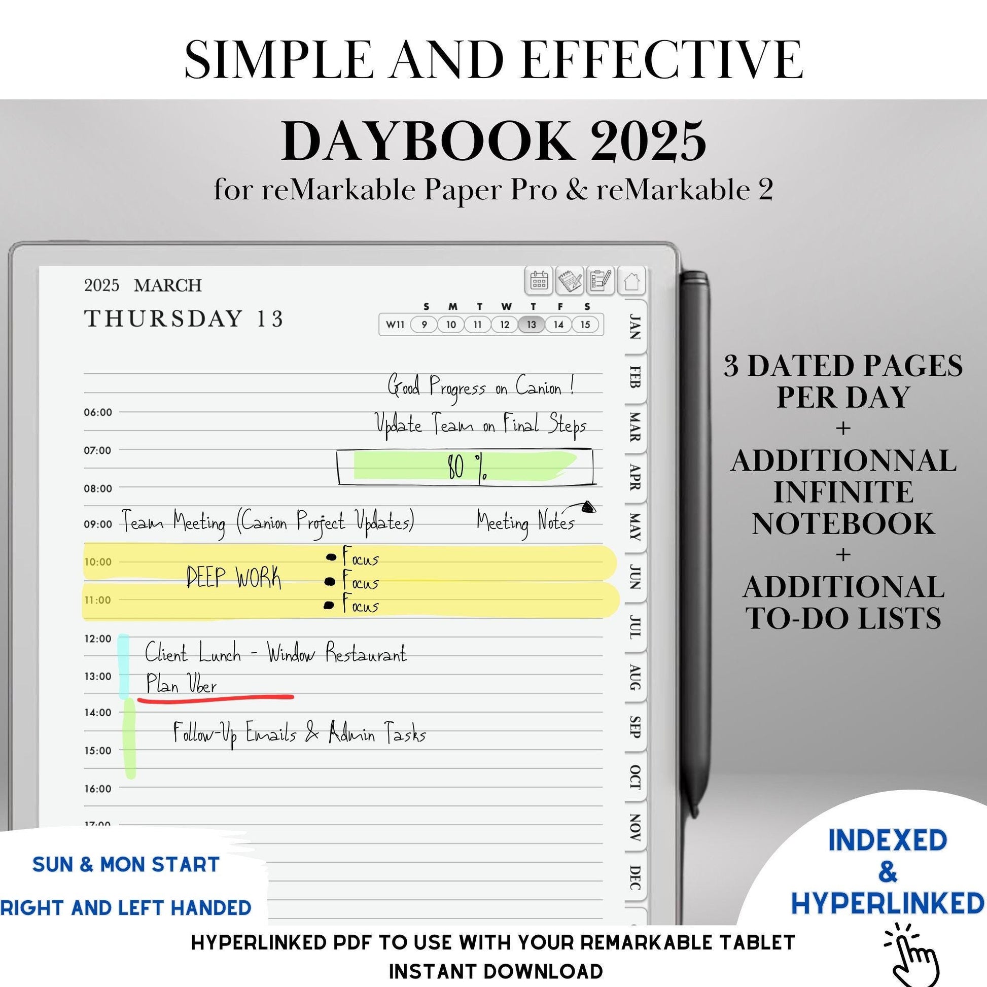 Take control of your time, tasks, and goals with this fully hyperlinked 2025 digital planner, designed for reMarkable 2 & reMarkable Paper Pro. Whether you’re a professional, student, or entrepreneur, this productivity-focused planner helps you stay organized, efficient, and stress-free—all while embracing a paperless workflow.