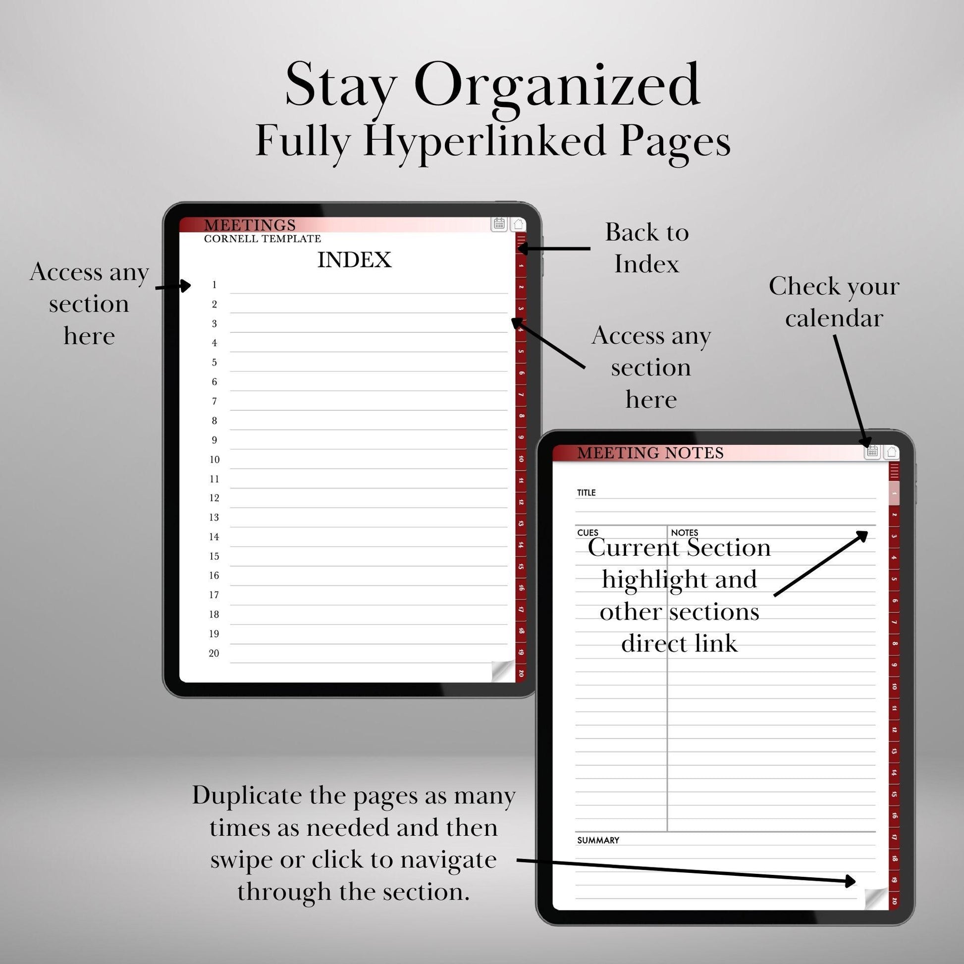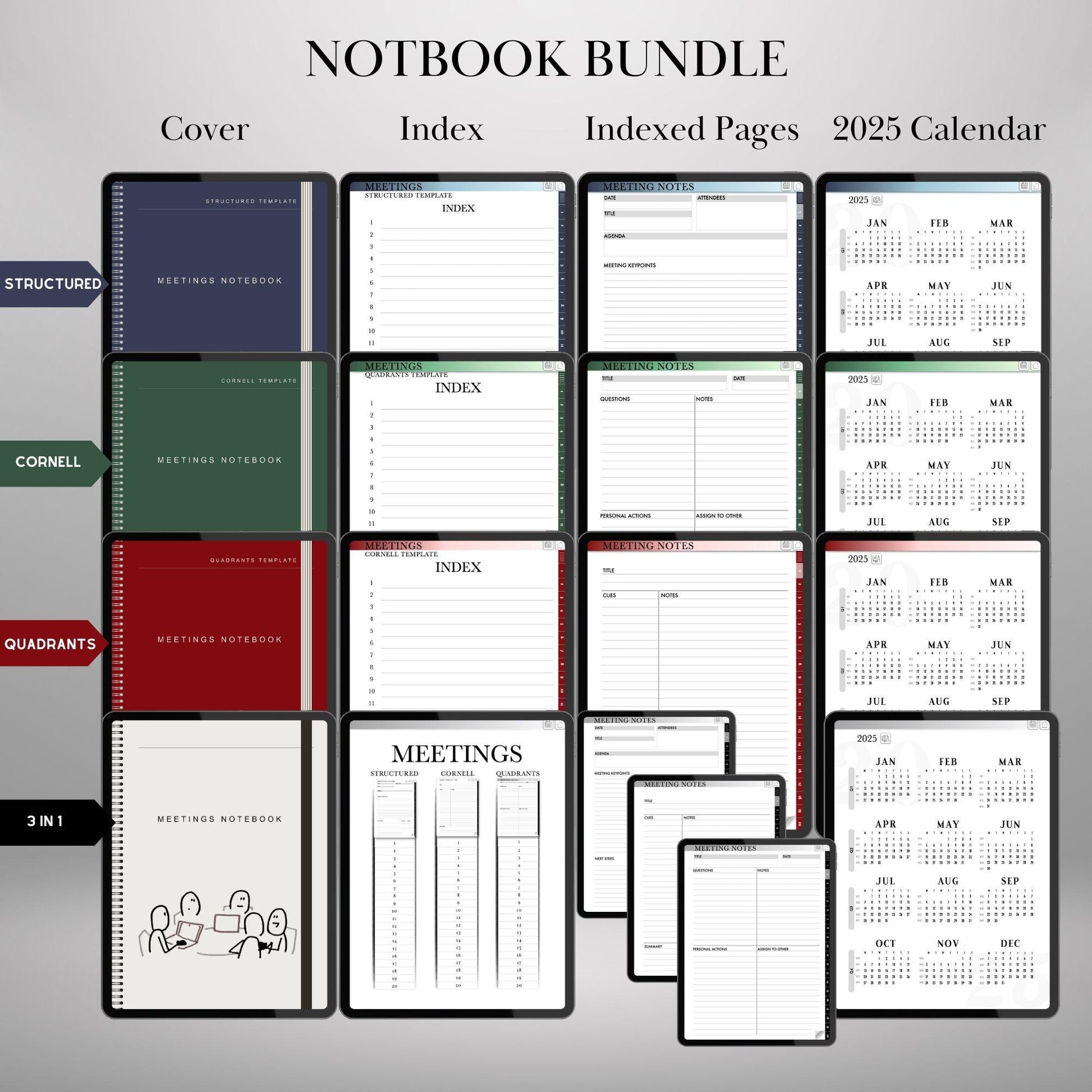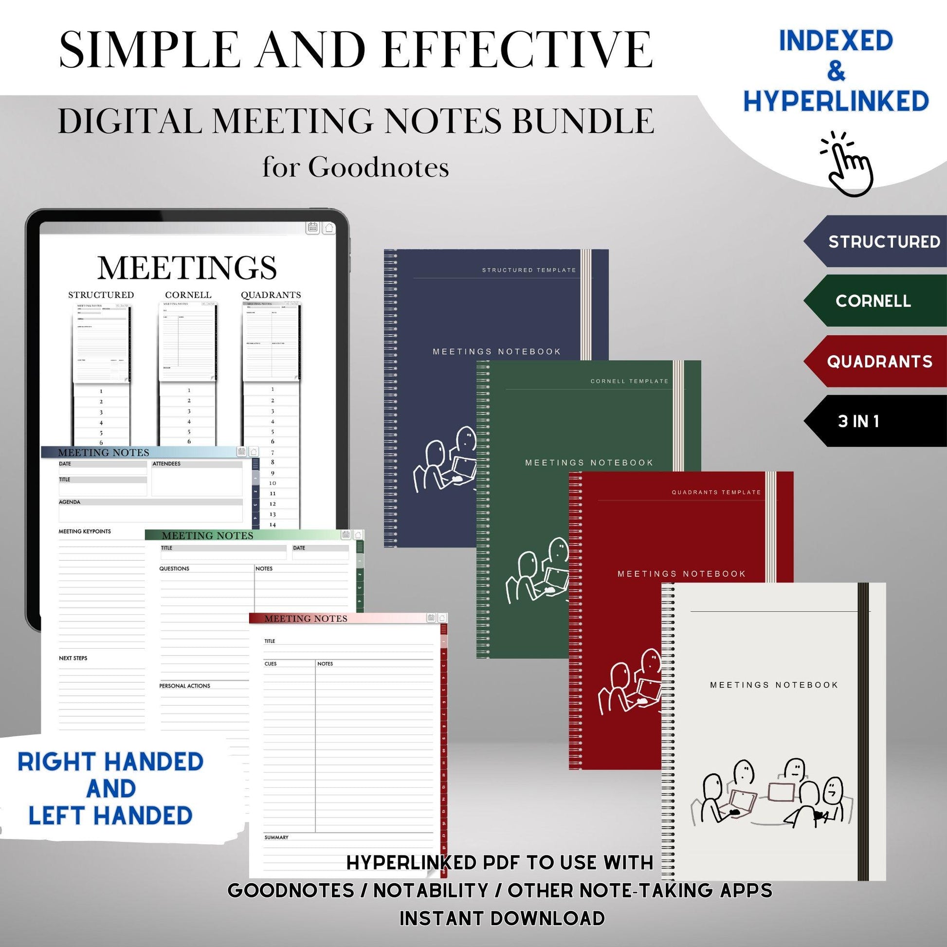 Digital meeting notebook Bundle Cornell, Structured and Quandrants layouts | digital notebook Cornell | Goodnotes Hyperlinked Notes Template