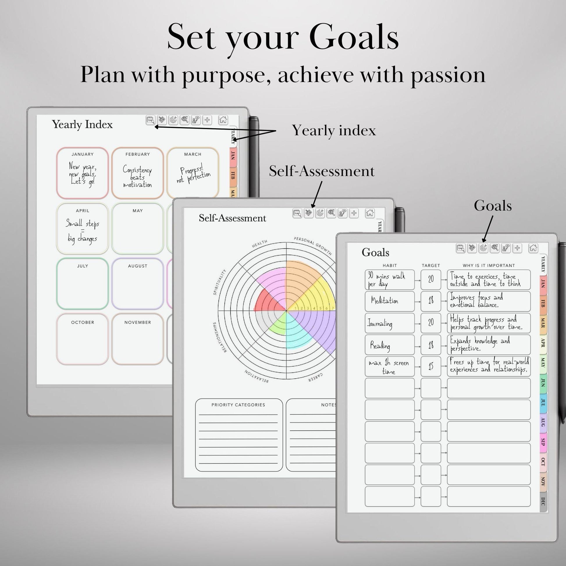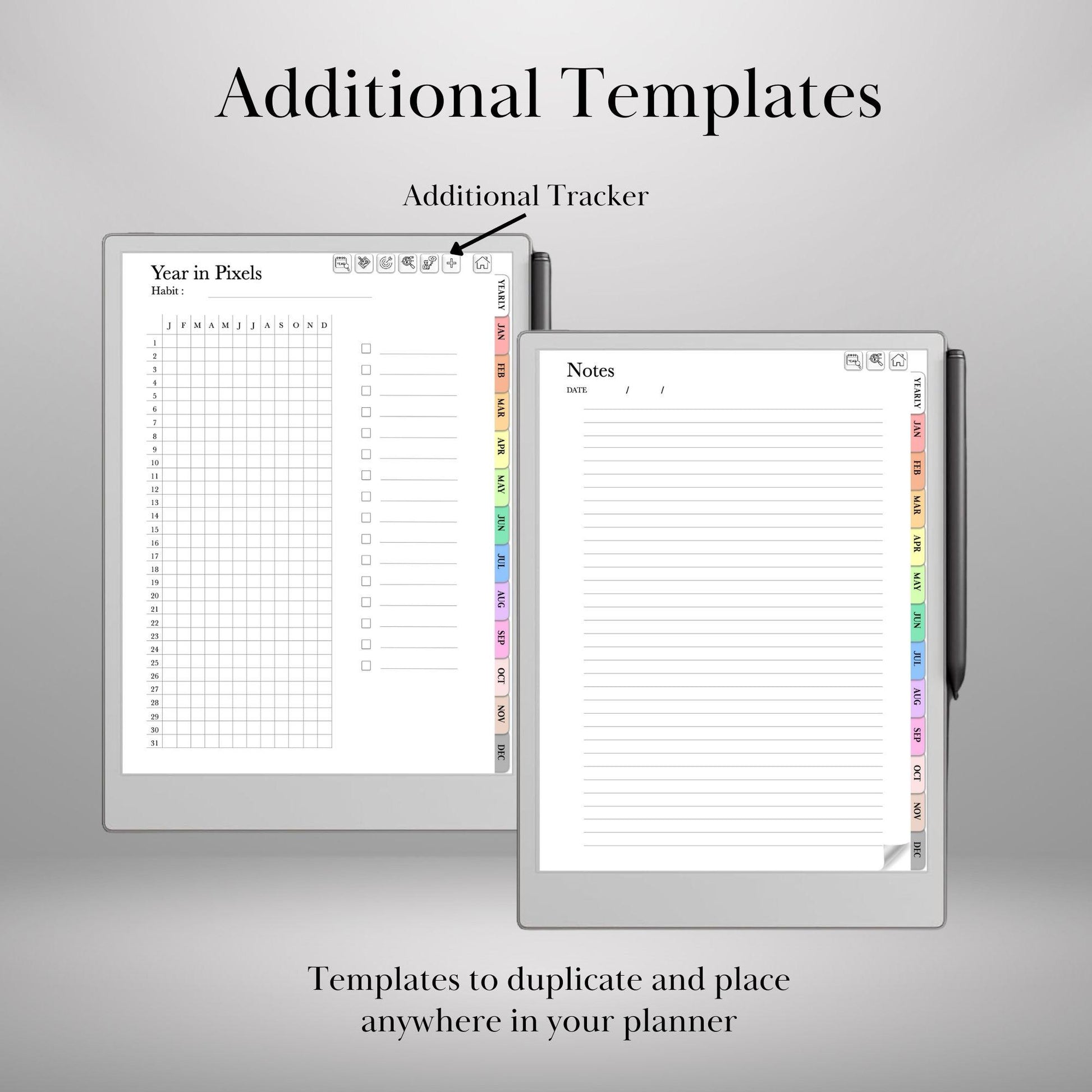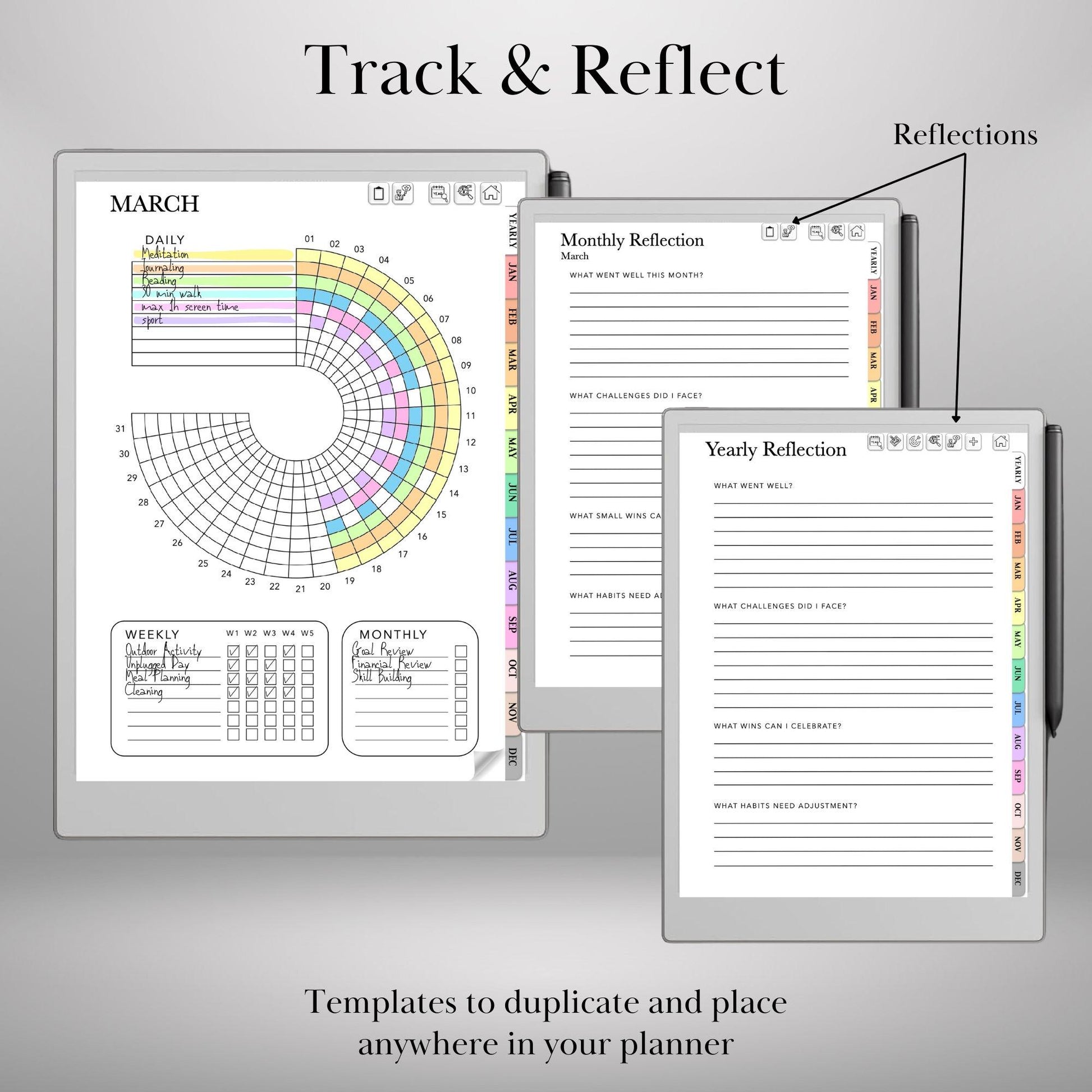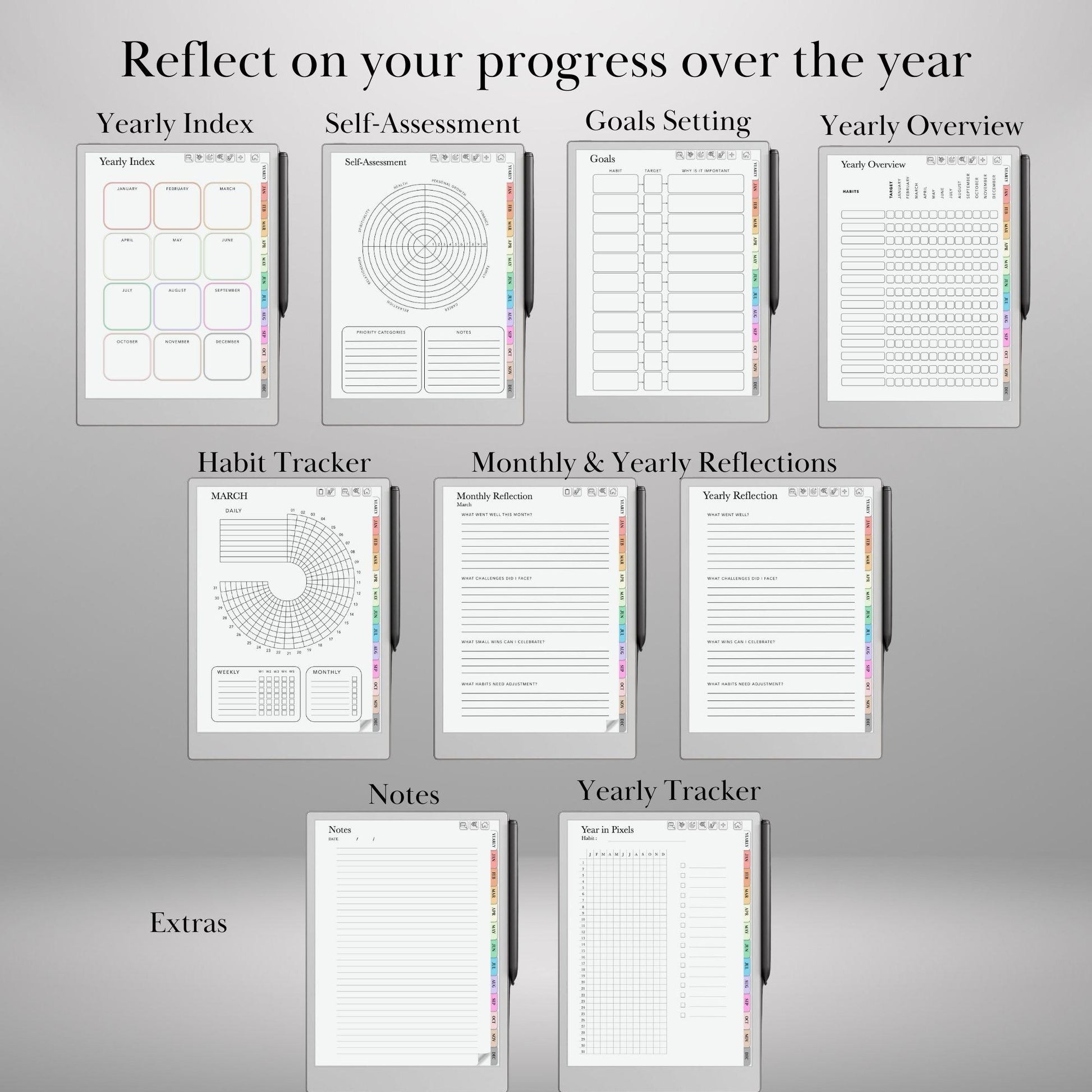 Stay on track with your goals, build better habits, and reflect on your progress with this hyperlinked habit tracker and goal-setting planner, designed specifically for reMarkable 2 & reMarkable Paper Pro. Whether you want to track daily routines, long-term goals, or monthly reflections, this fully hyperlinked digital tracker helps you stay consistent and motivated—all within a minimalist and distraction-free layout.