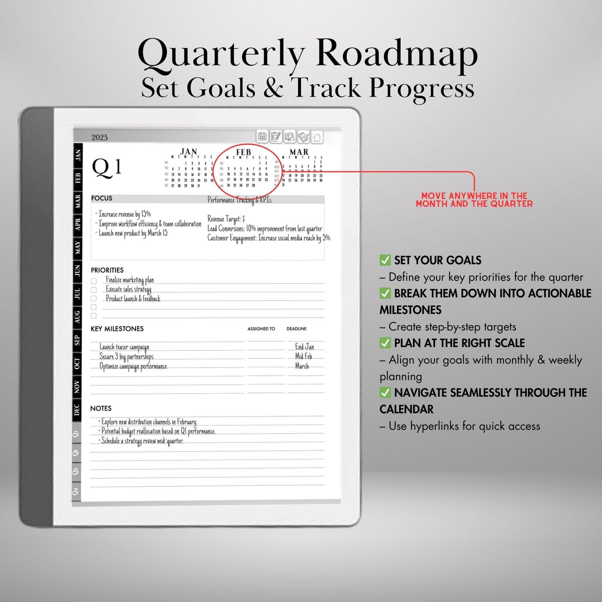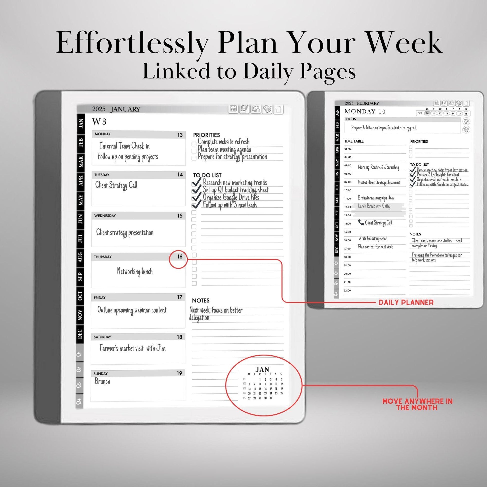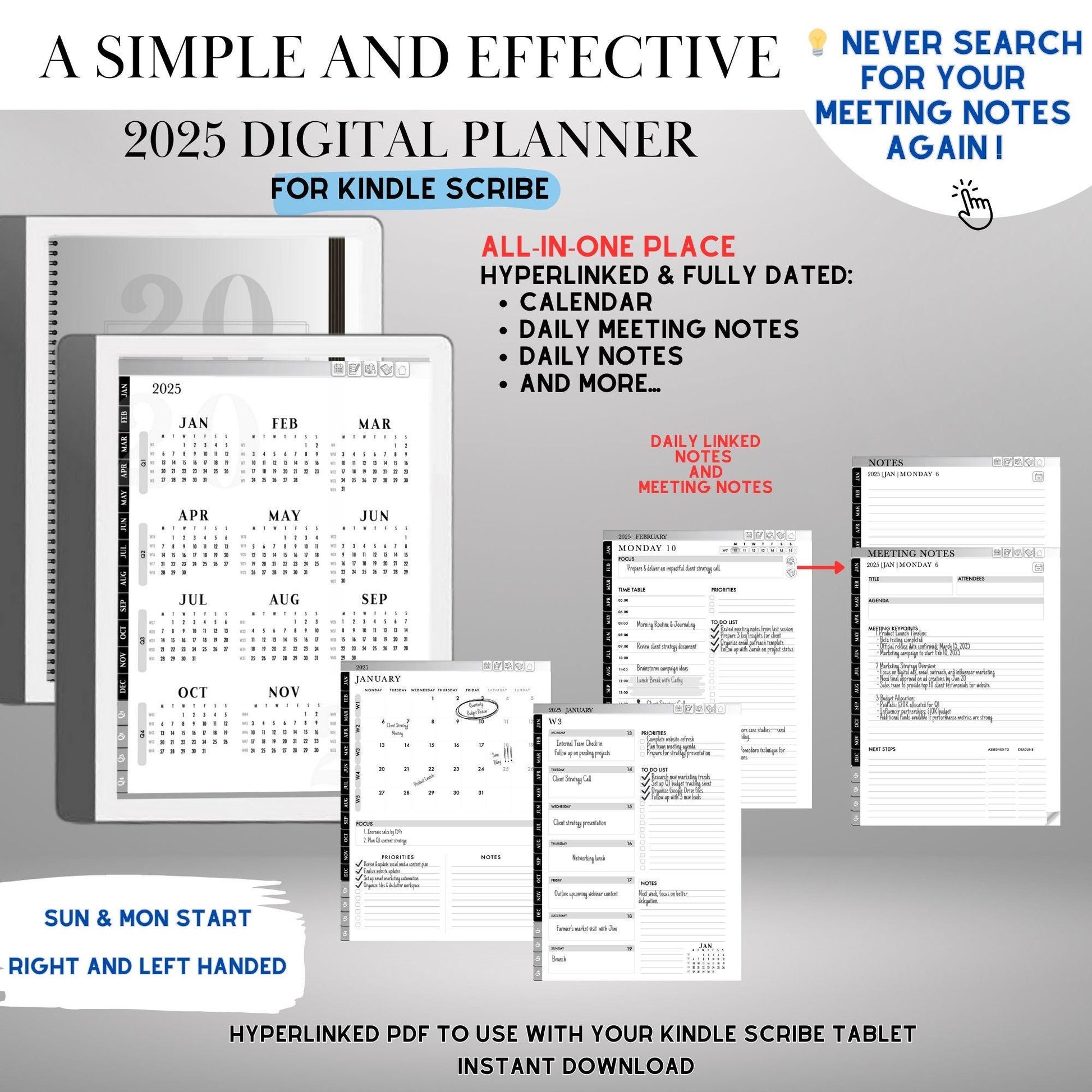 – Fully hyperlinked & dated 2025 planner, compatible with Kindle Scribe and other e-ink tablets that support PDF annotation.