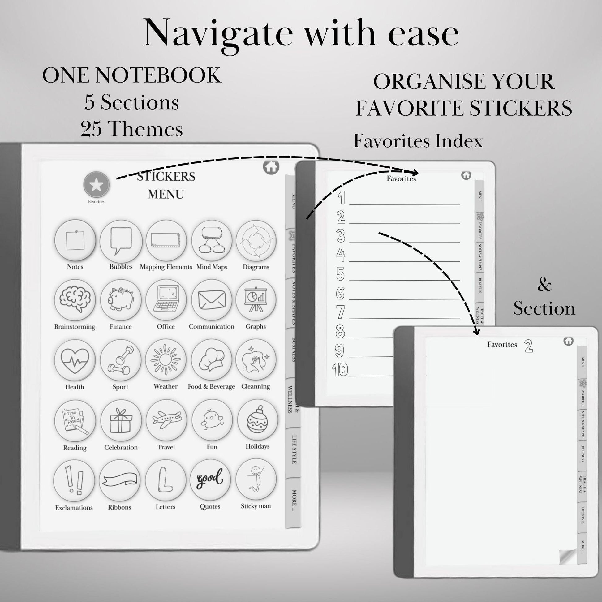 Organized into 5 key categories and 25 creative themes, these black-and-white stickers are ideal for stylus use. You’ll also receive a hyperlinked Favorites Notebook to store and reuse your most-loved stickers anytime.