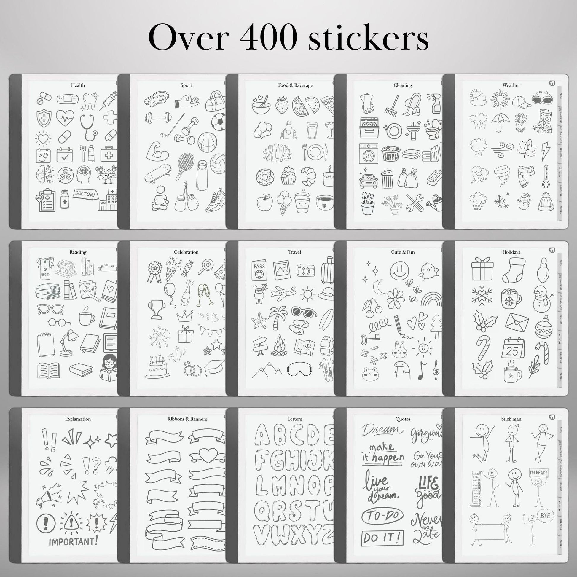 Transform your Kindle Scribe into a functional and creative digital planner with this bundle of 400+ high-resolution traceable stickers. Designed specifically for Kindle Scribe's e-ink interface, this pack is perfect for enhancing notes, organizing thoughts, and adding visual clarity to your digital pages—without overwhelming your minimalist space.