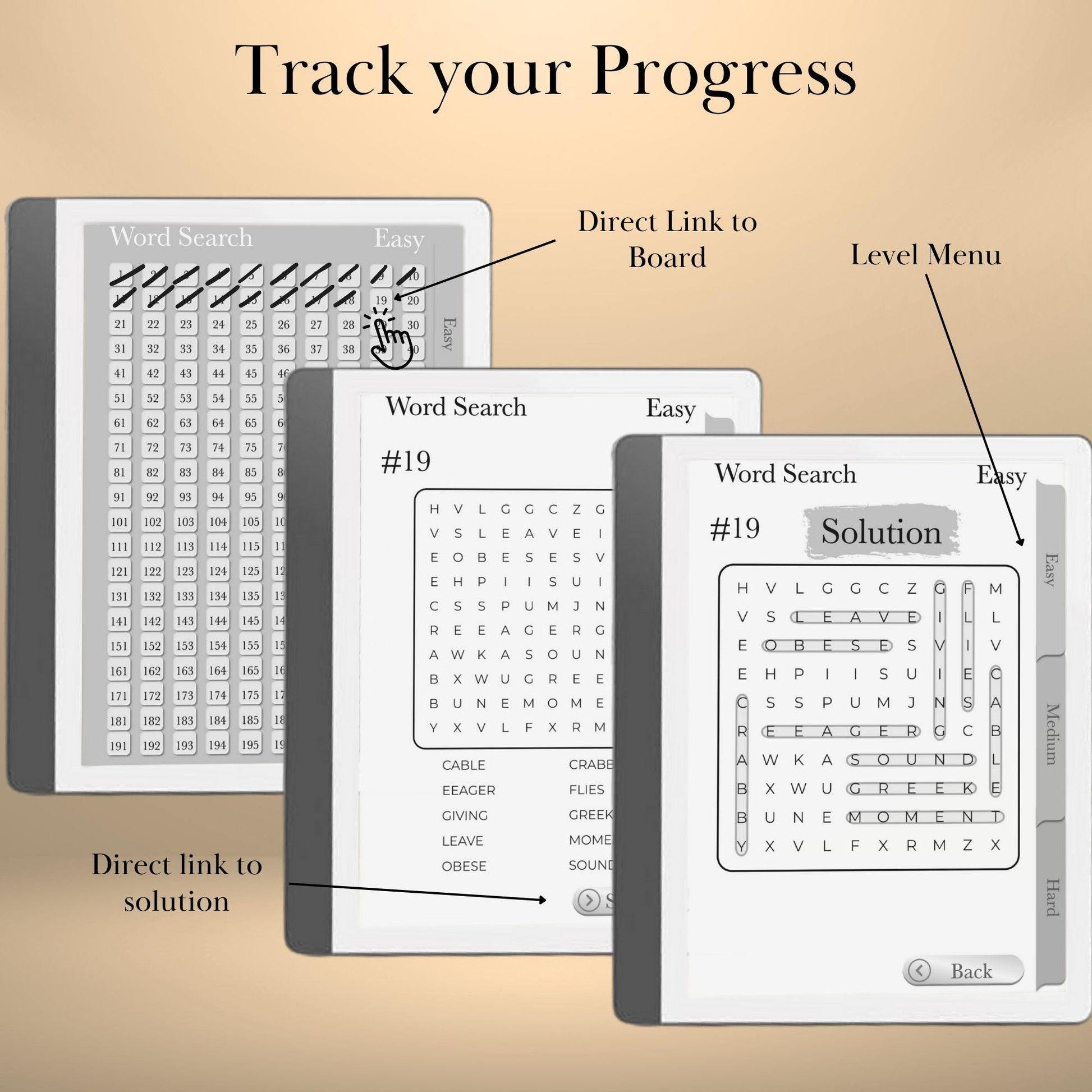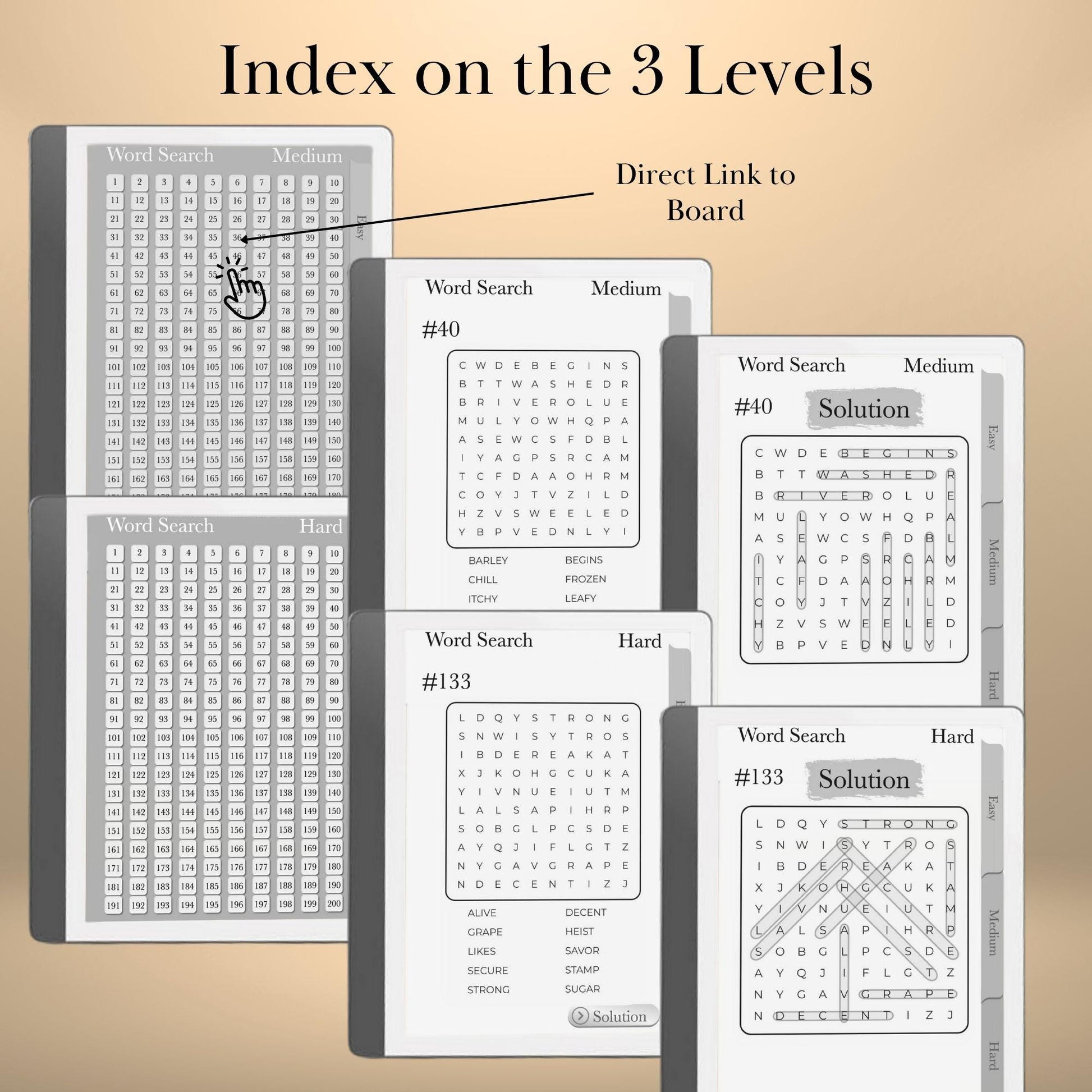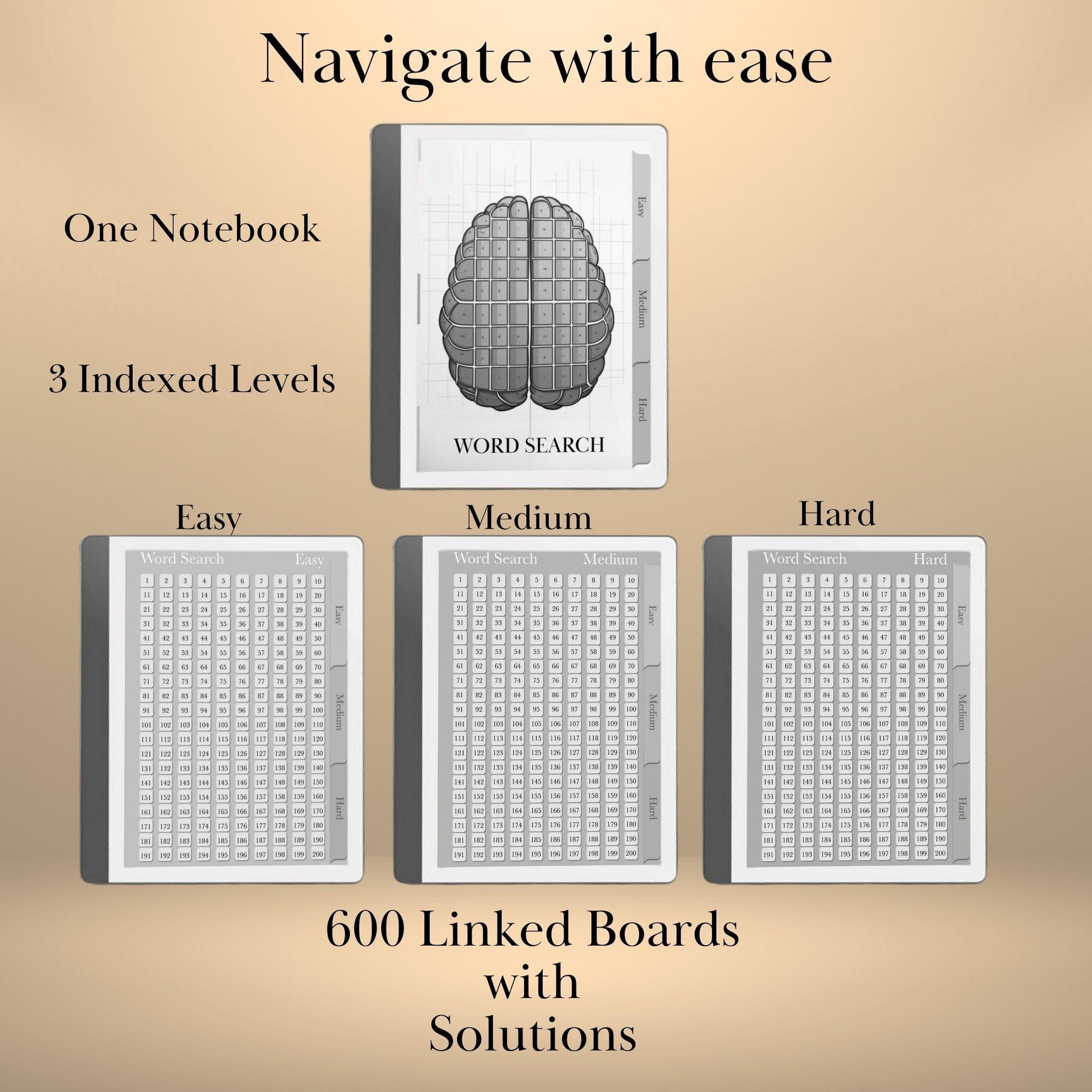 Sharpen your mind and relax your soul with this beautifully designed hyperlinked Word Search Puzzle Book, tailored specifically for the Kindle Scribe. With 600 themed puzzles (Easy, Medium, Hard) and intuitive navigation, this minimalist e-ink activity book offers an immersive and distraction-free brain workout—perfect for your Kindle Scribe’s monochrome display.