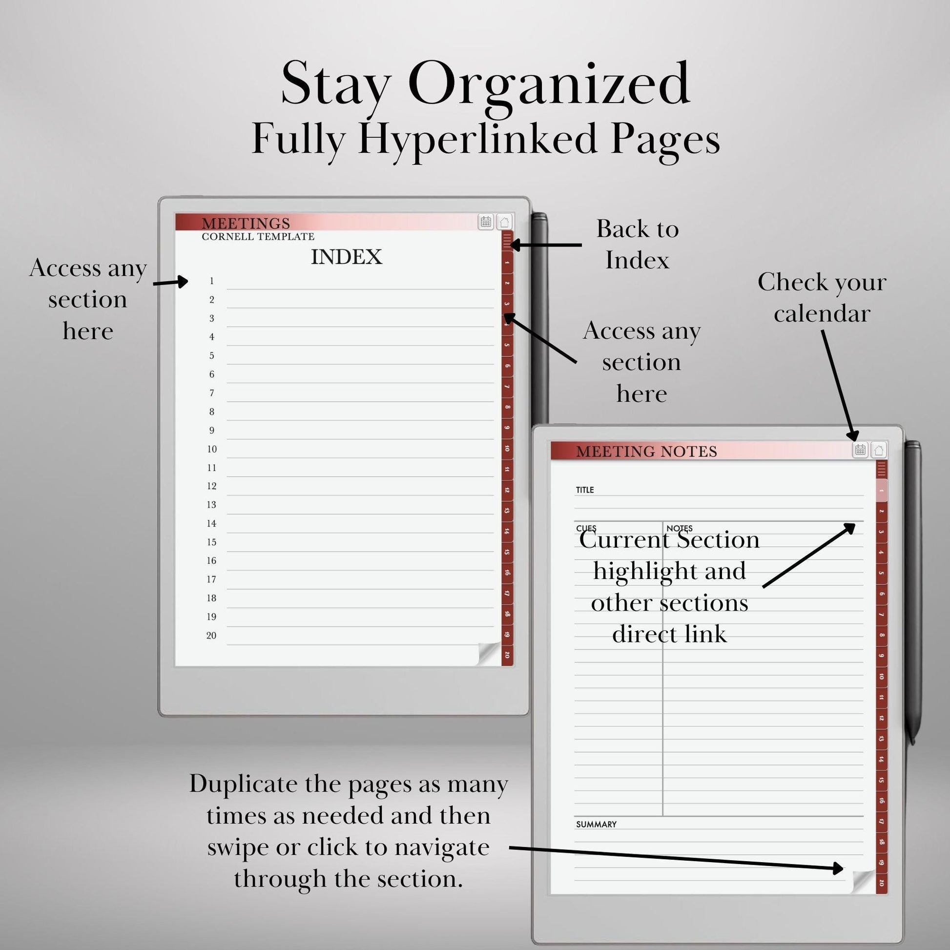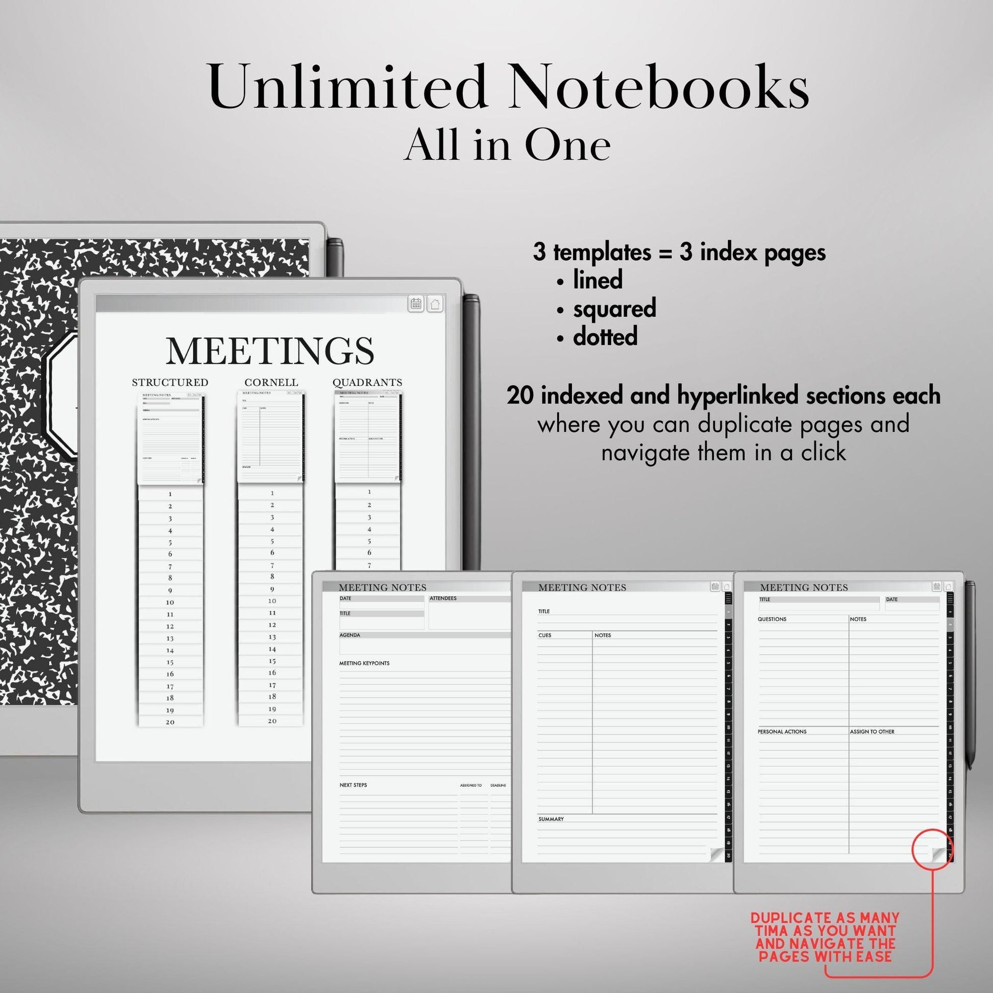 Boost your meeting productivity and note organization with this structured, hyperlinked, and indexed digital notebook bundle, designed specifically for professionals, students, and business owners. Whether you’re in team meetings, brainstorming sessions, or client calls, this bundle ensures that your notes are structured, easy to access, and well-organized on your reMarkable tablet.