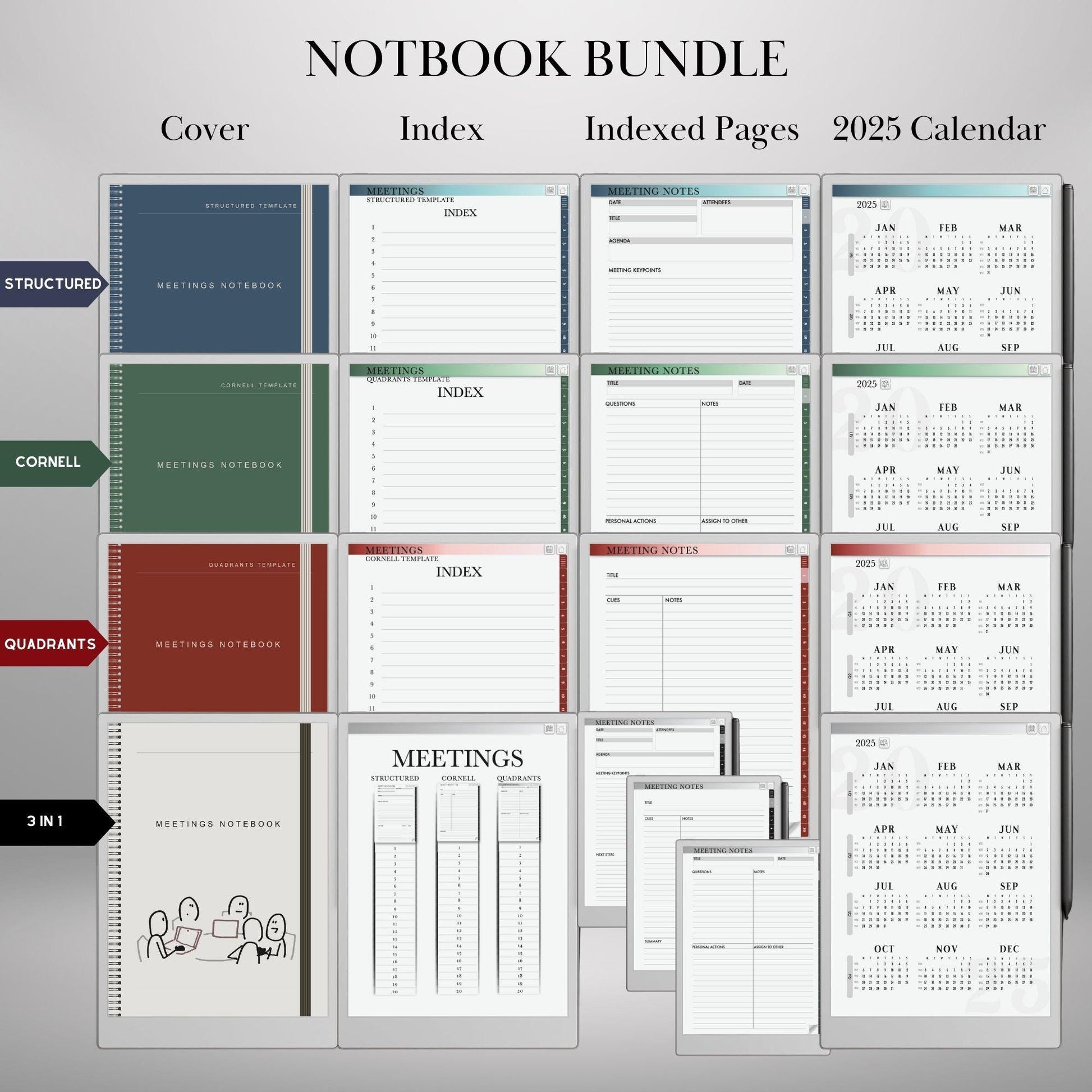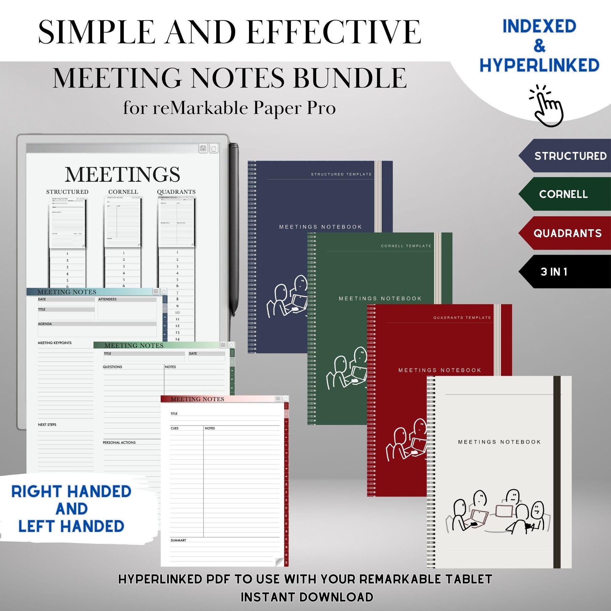 Meeting Notebooks Bundle for reMarkable Paper Pro, Structured, Cornell and Quandrants layouts, Hyperlinked and Indexed e-Ink Templates