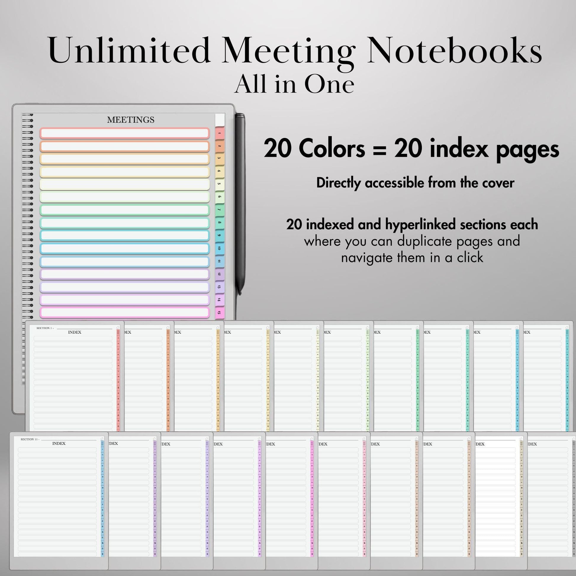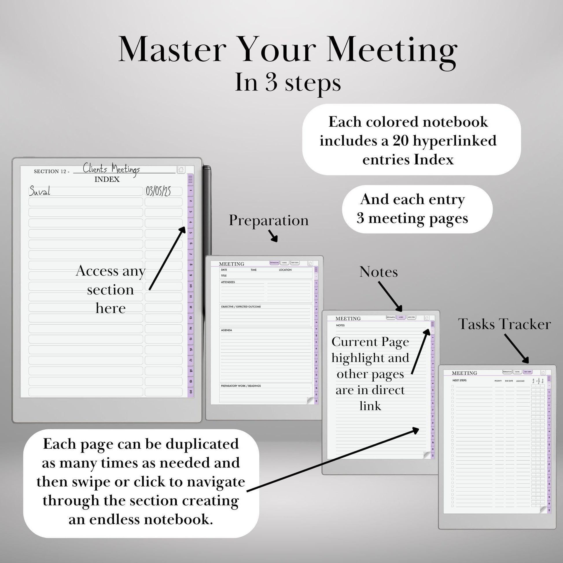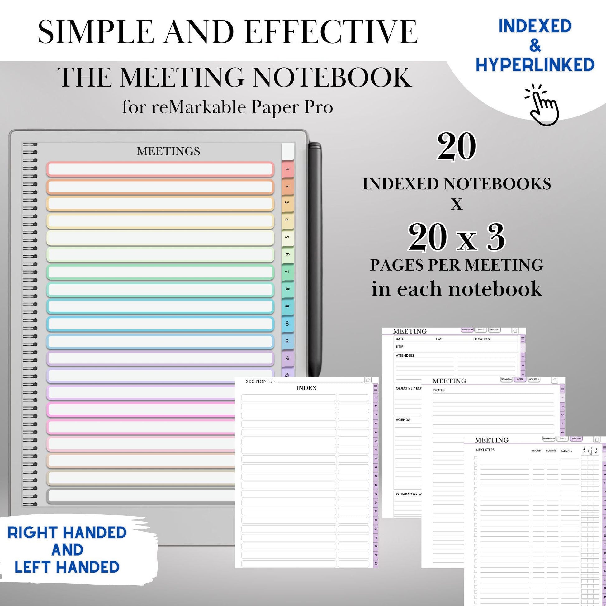 Maximize your productivity with this hyperlinked, structured meeting notes notebook, specifically designed for Paper Pro and reMarkable 2 &. Whether youβre managing client meetings, team discussions, or business strategies, this digital meeting planner ensures your notes stay organized, accessible, and action-driven.