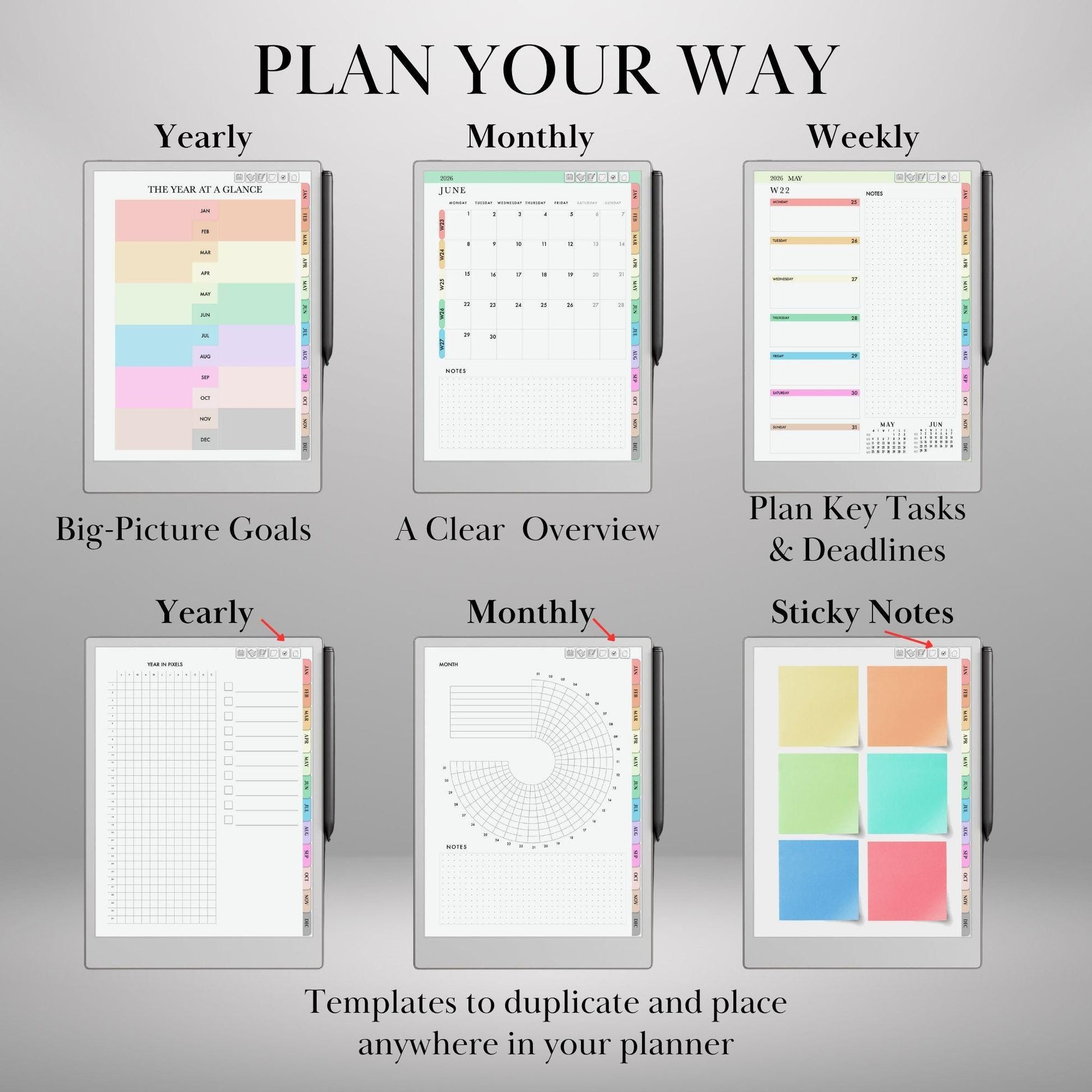 Start 2026 with clarity, intention, and structure using this beautifully designed, fully hyperlinked Daily Journal & Planner, built exclusively for the reMarkable Paper Pro and reMarkable 2 tablets. With vibrant color-coded navigation and distraction-free pages, it’s the ideal tool for mindful journaling, goal setting, habit tracking, and organizing your entire year—one day at a time.