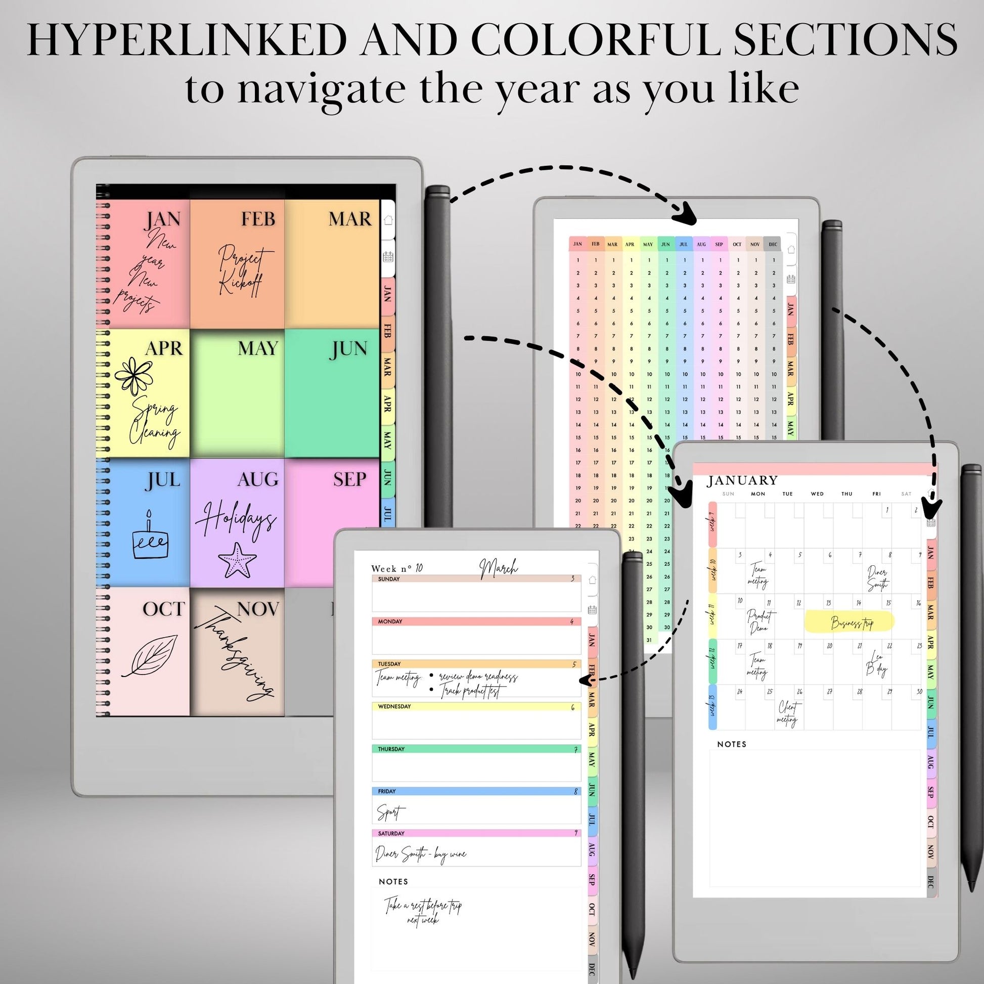 ✔ Hyperlinked Layouts – Navigate between yearly, monthly, weekly, and daily views instantly
