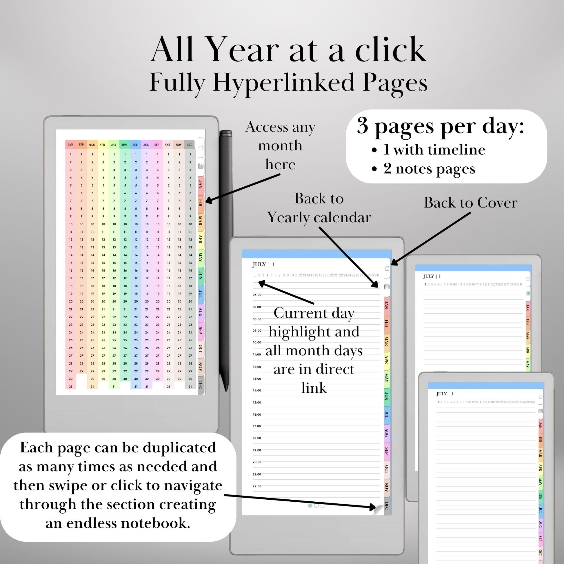 Perpetual Calendar for reMarkable Paper Pro Move Templates, Daily planner Undated Monthly Weekly Daily Hourly Hyperlinked Planner