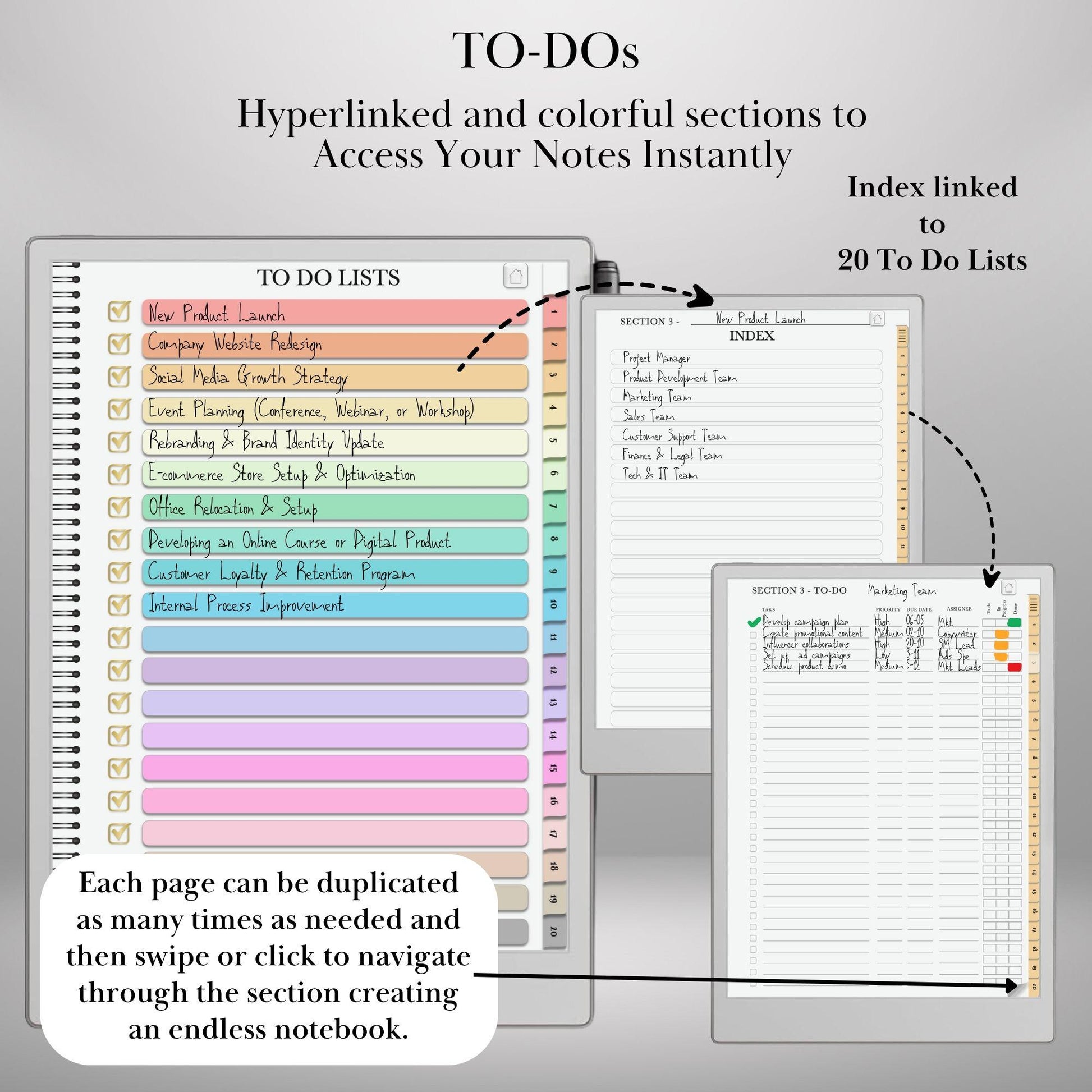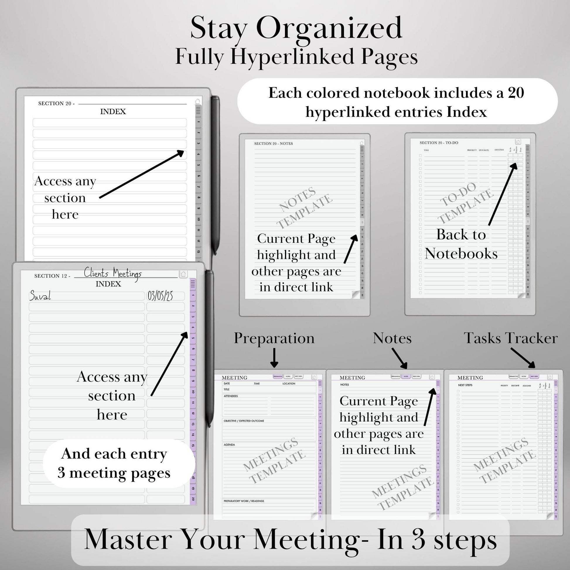 Boost your organization and productivity with this all-in-one bundle designed for your reMarkable Paper Pro or reMarkable 2 tablet. Featuring three powerful tools—Hyperlinked Digital Notebooks, a To-Do List Planner, and a Meeting Notes Template—this bundle is perfect for professionals, students, creatives, and anyone seeking structured, paperless planning.