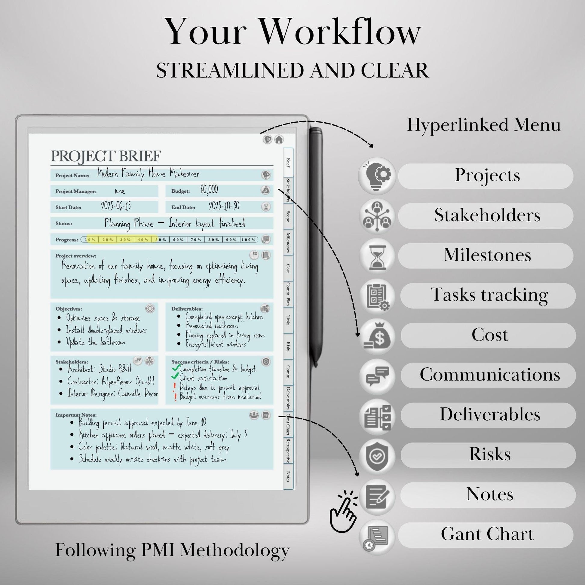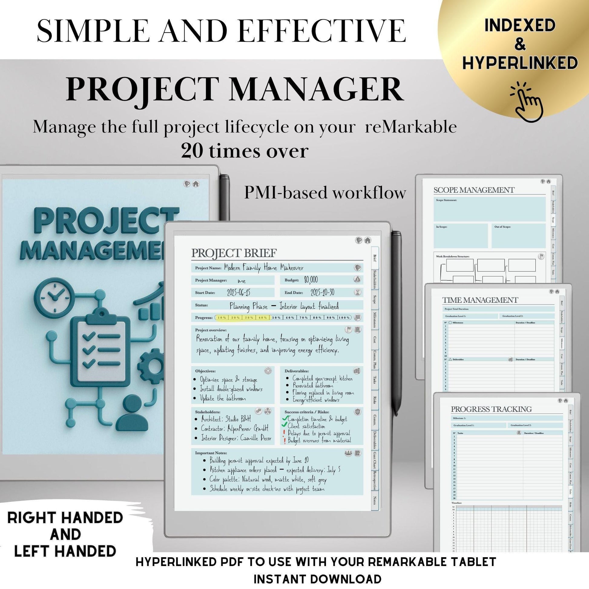Project Management Template for reMarkable 2 & Paper Pro Hyperlinked Template PMI Workflow Project Planner Productivity Project Tracker