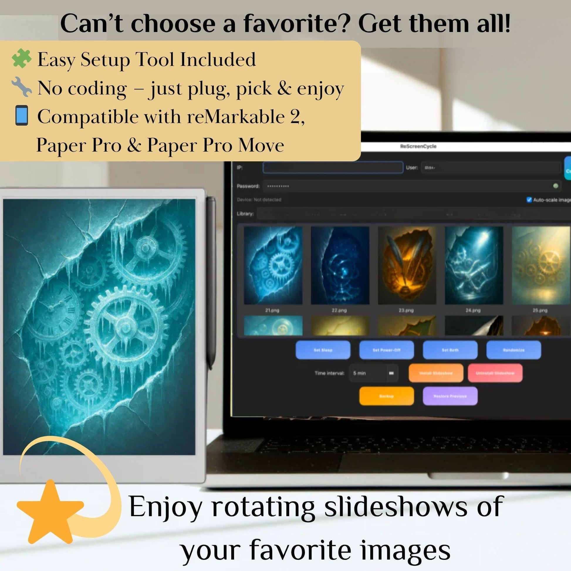 ✔ High-Resolution PNG Files – Optimized for both reMarkable 2 and Paper Pro dimensions ✔ Customization Tool Included – Upload, switch, and rotate designs easily (works on Mac & Windows) ✔ Full Setup Guide – Step-by-step instructions for manual or tool-based installation ✔ Instant Digital Download – Access and personalize your reMarkable right away