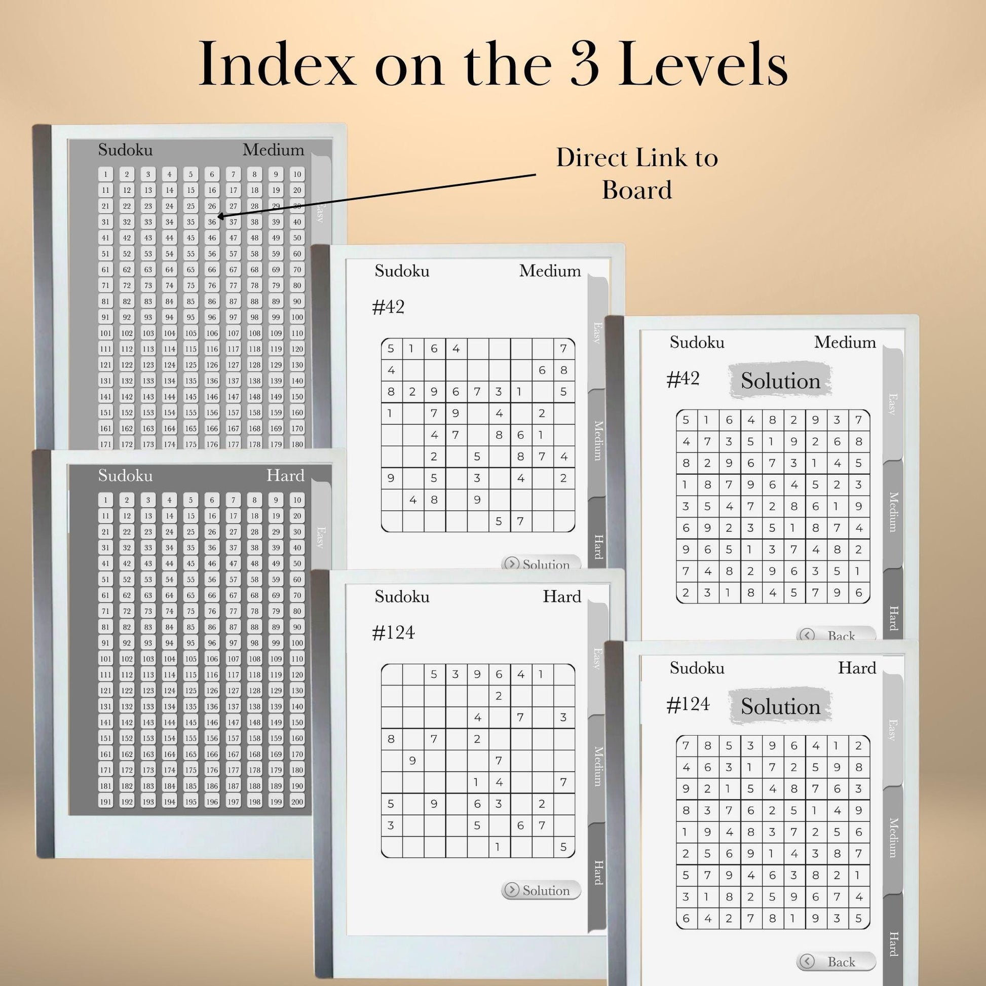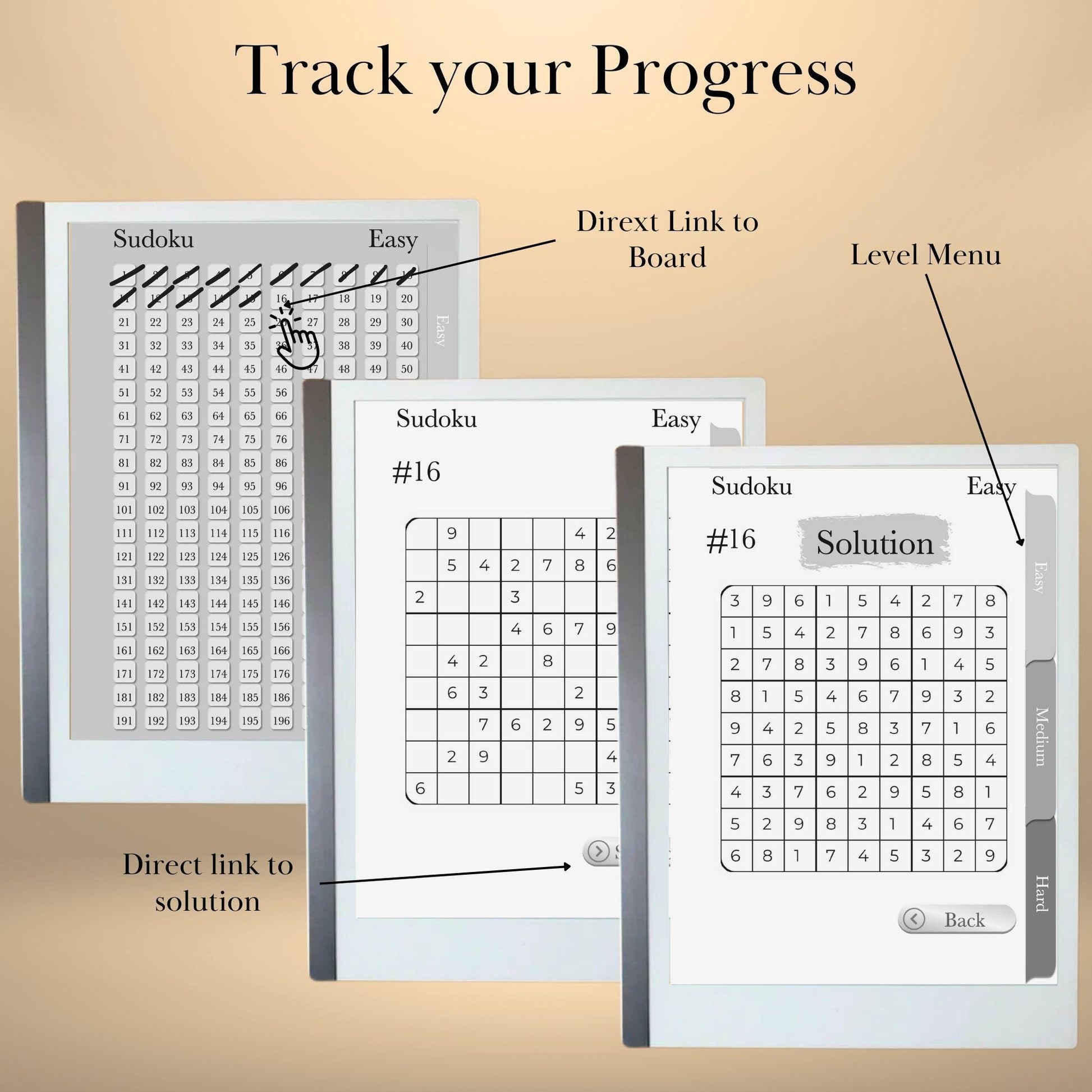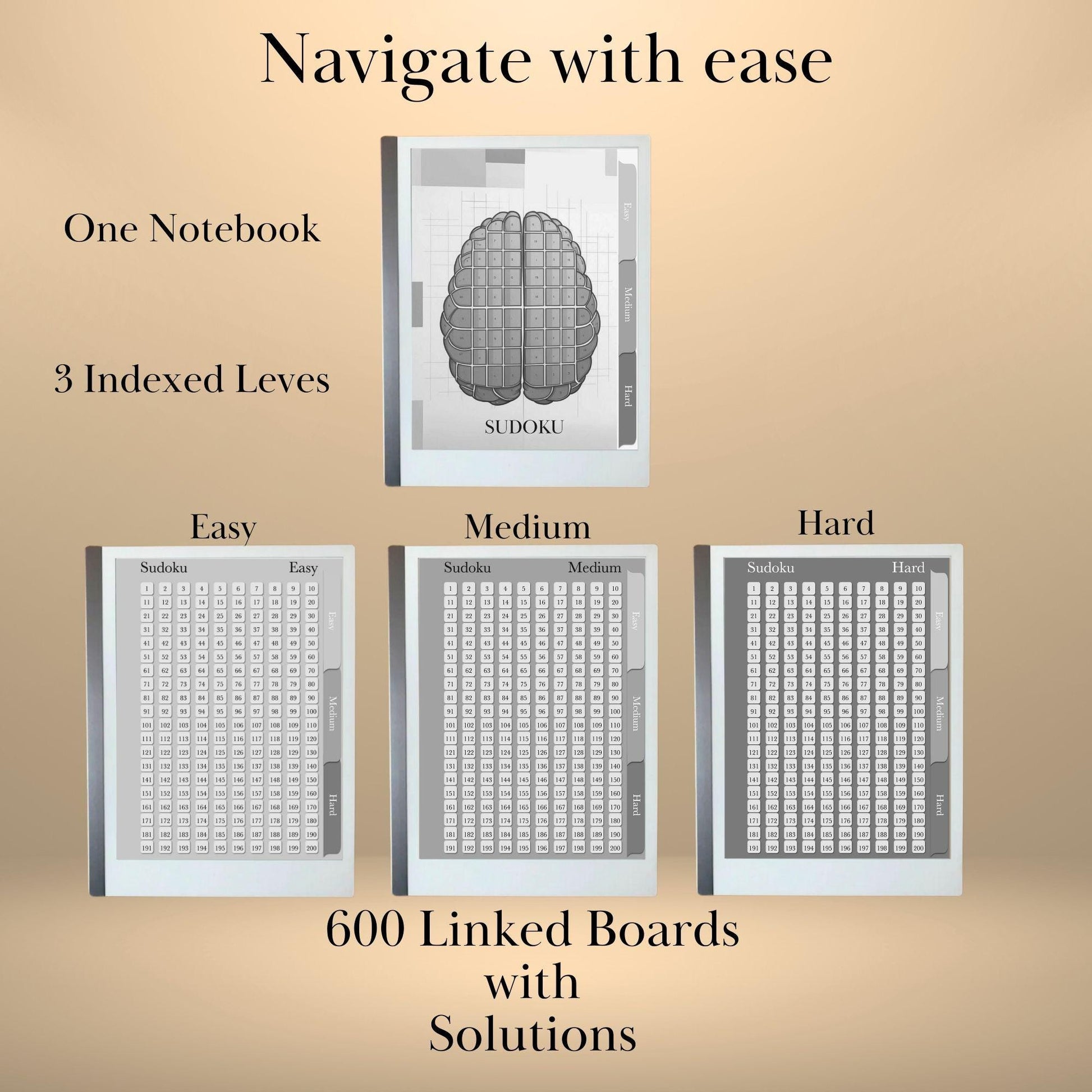 Challenge your mind and enjoy hours of brain-boosting fun with this hyperlinked Sudoku Puzzle Book, specially designed for the reMarkable 2 tablets. Featuring 600 Sudoku puzzles across three difficulty levels (Easy, Medium, Hard), this digital book offers seamless navigation, clean layouts, and a distraction-free puzzling experience.