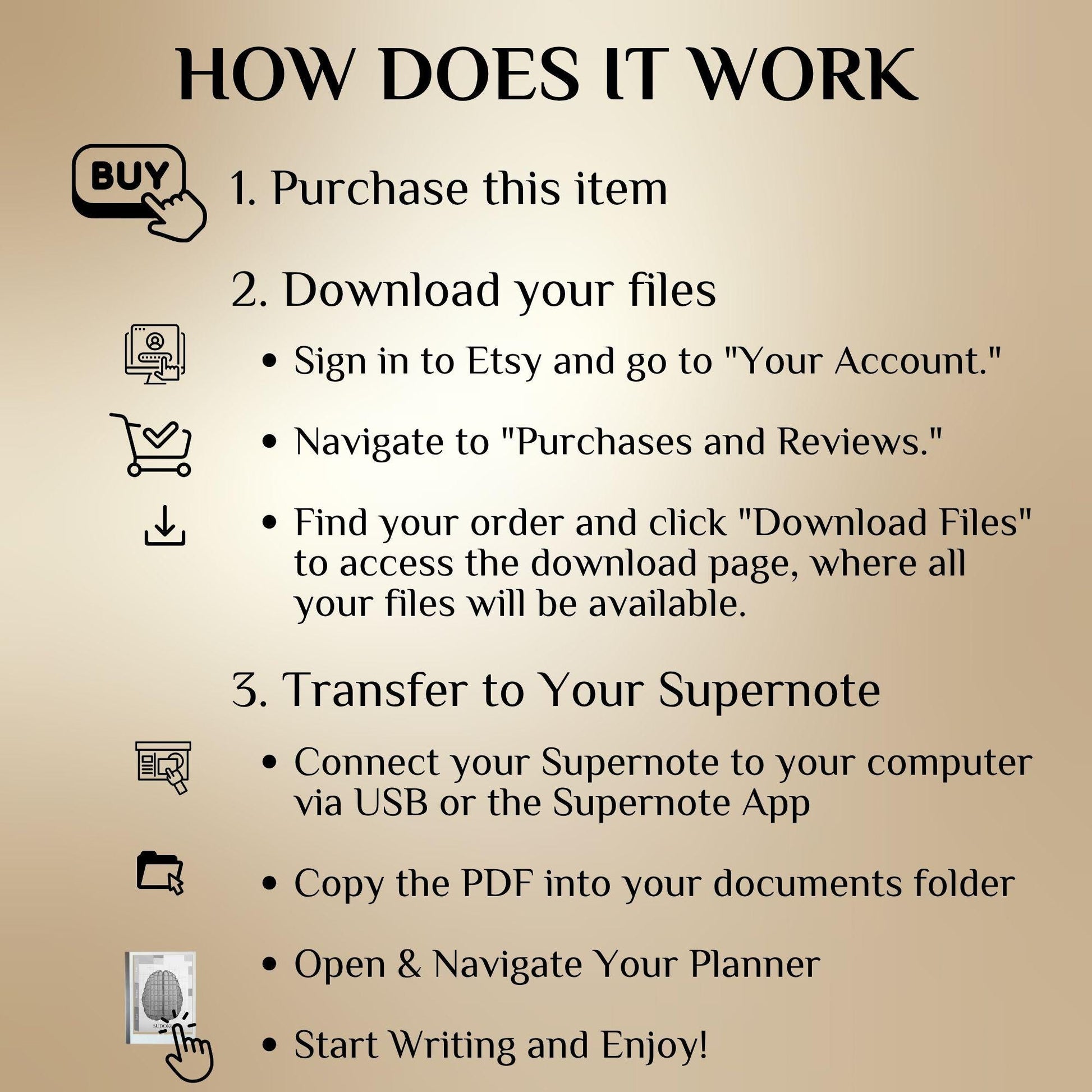 🖋️ HOW TO USE 1️⃣ Download your files instantly after purchase 2️⃣ Import into your Supernote using USB or Supernote Cloud 3️⃣ Navigate via hyperlinks and solve directly with your stylus 4️⃣ Duplicate pages or re-use as many times as you'd like