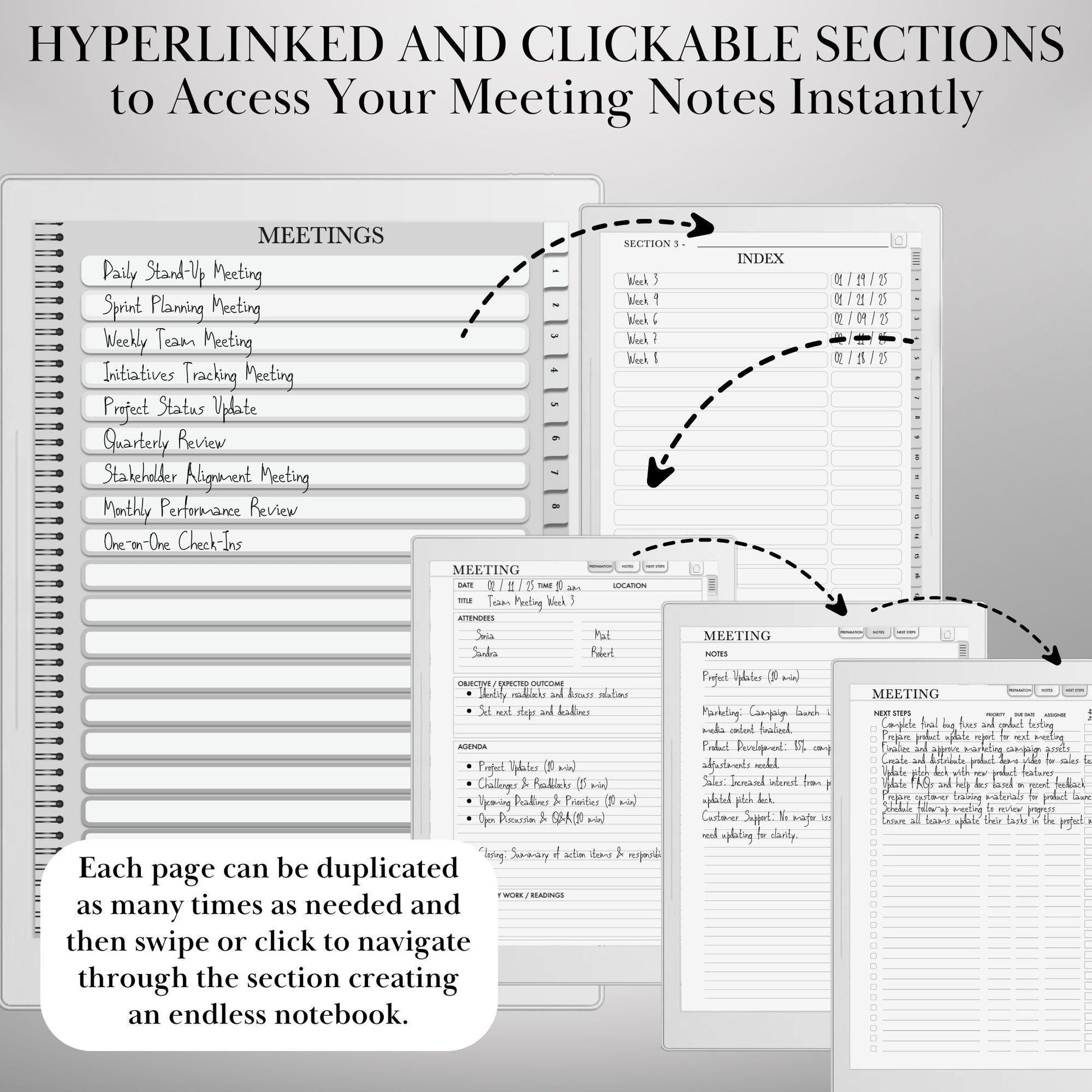 Reusable templates for each meeting: • Meeting Prep Page • Notes Page • Action Plan Page