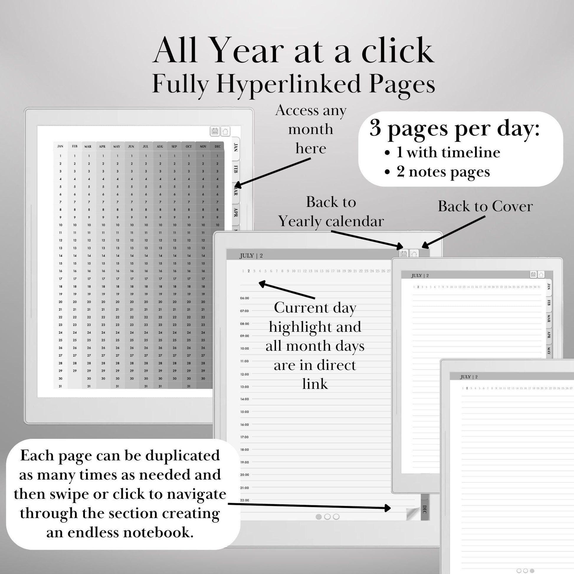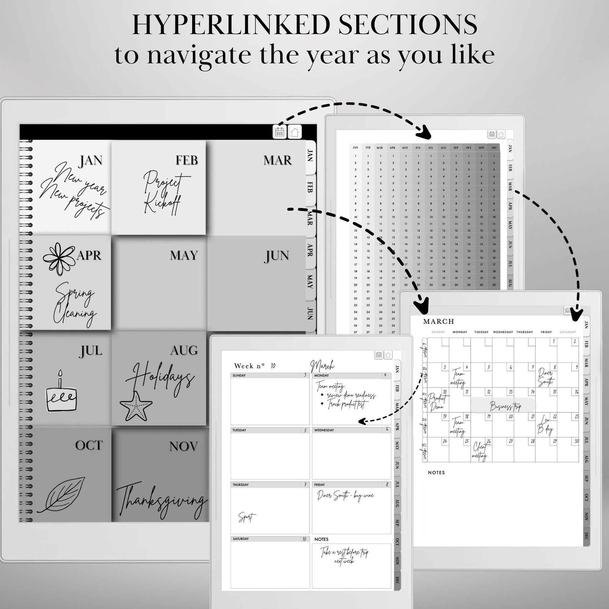 Stay focused and organized all year round with this minimalist black & white perpetual planner designed for the Supernote tablet. Featuring hyperlinked daily, weekly, and monthly pages, this timeless planner gives you complete flexibility to plan and reflect at your own pace—perfect for productivity, journaling, and habit tracking.