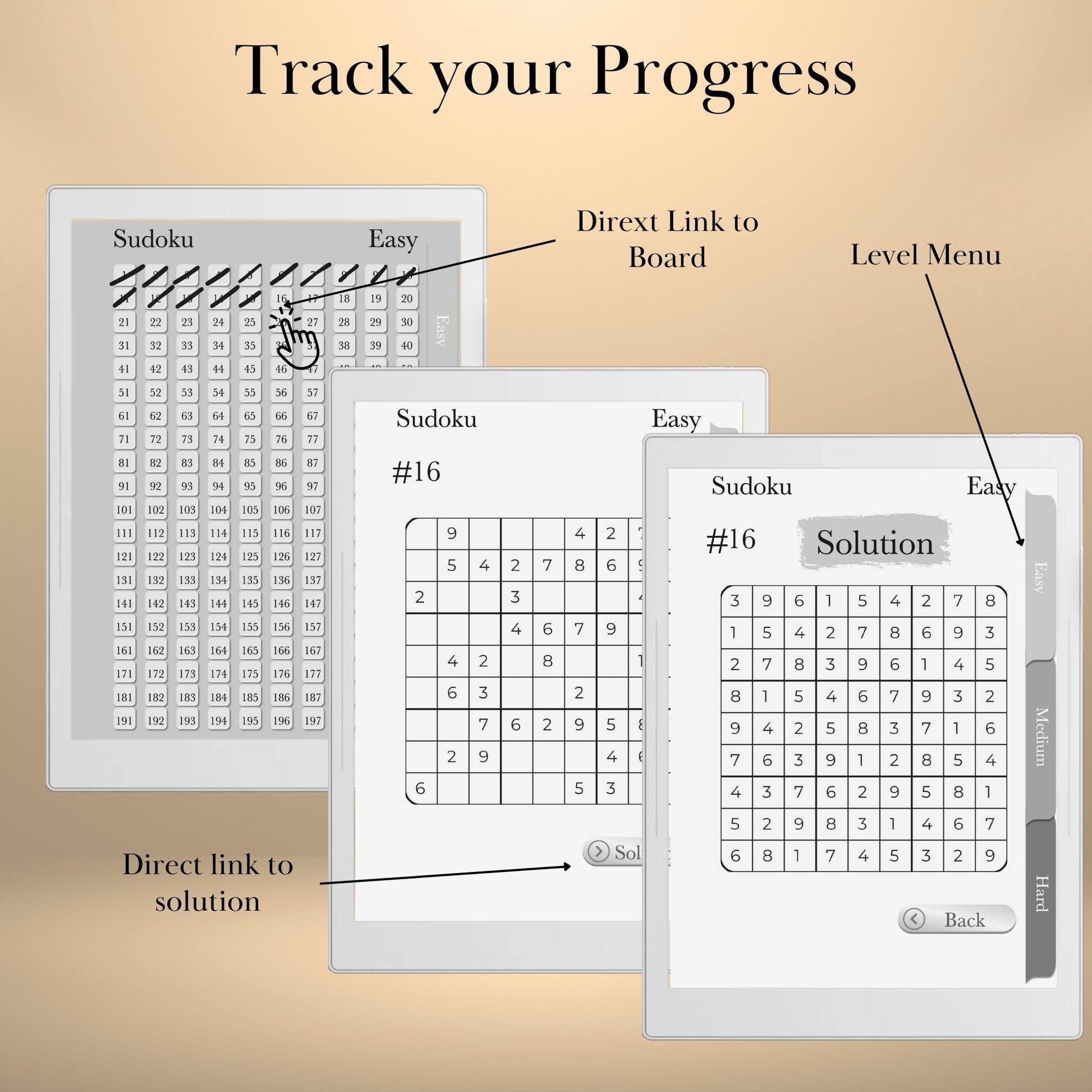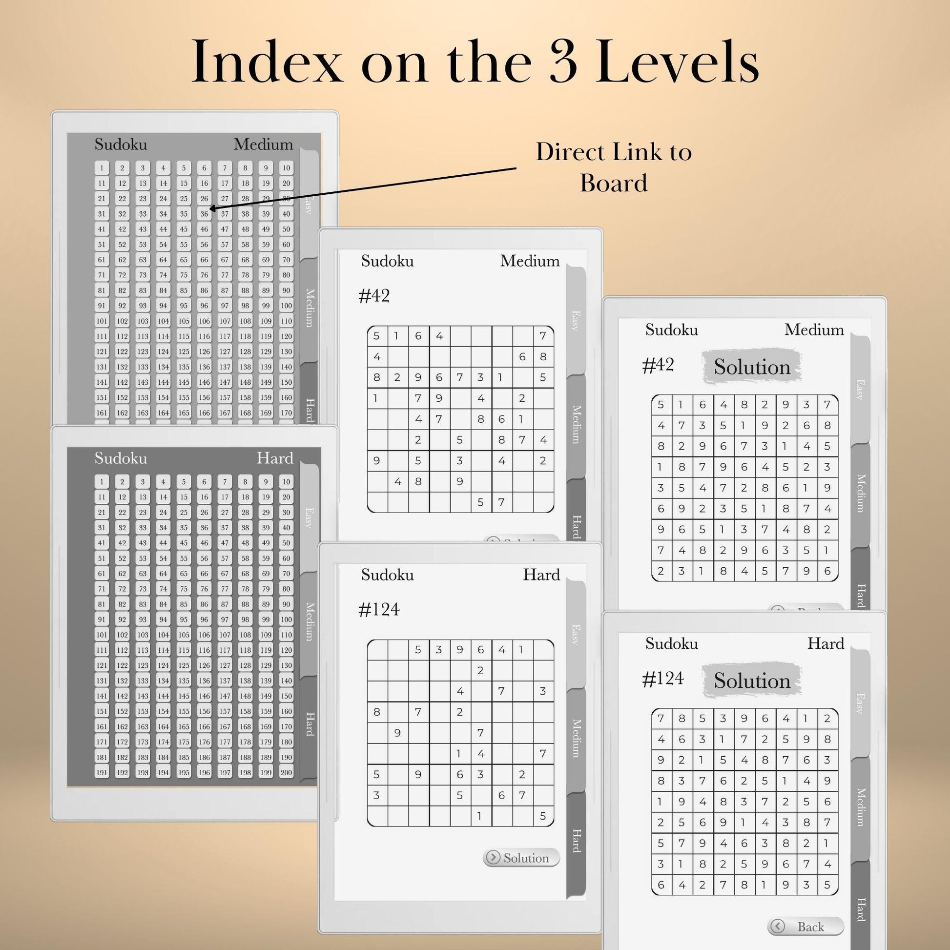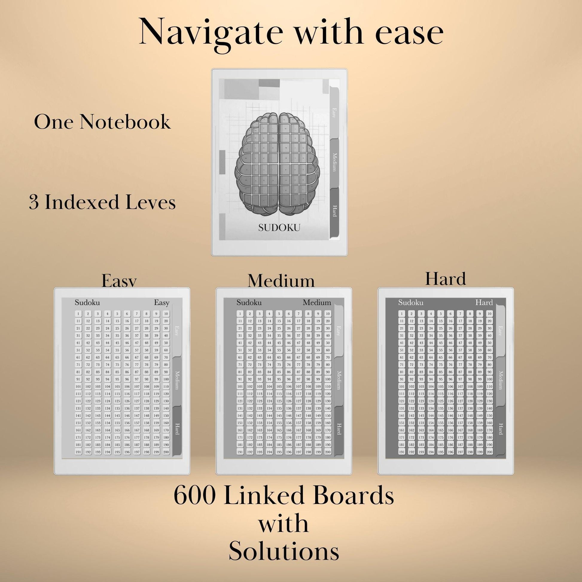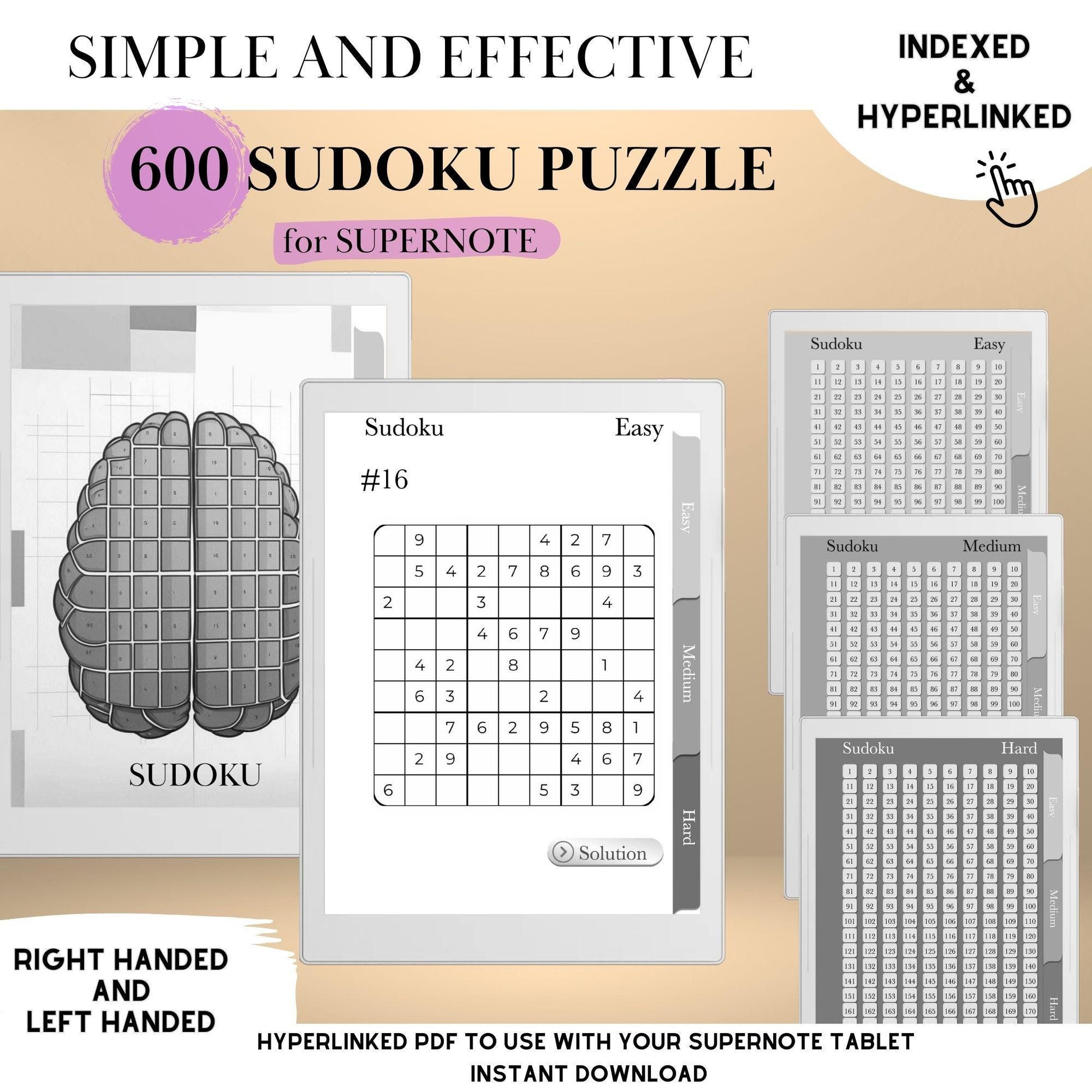 Challenge your mind and enjoy hours of brain-boosting fun with this hyperlinked Sudoku Puzzle Book, specially designed for Supernote tablets. Featuring 600 Sudoku puzzles across three difficulty levels (Easy, Medium, Hard), this digital book offers seamless navigation, clean layouts, and a distraction-free puzzling experience tailored to Supernote’s e-ink display.