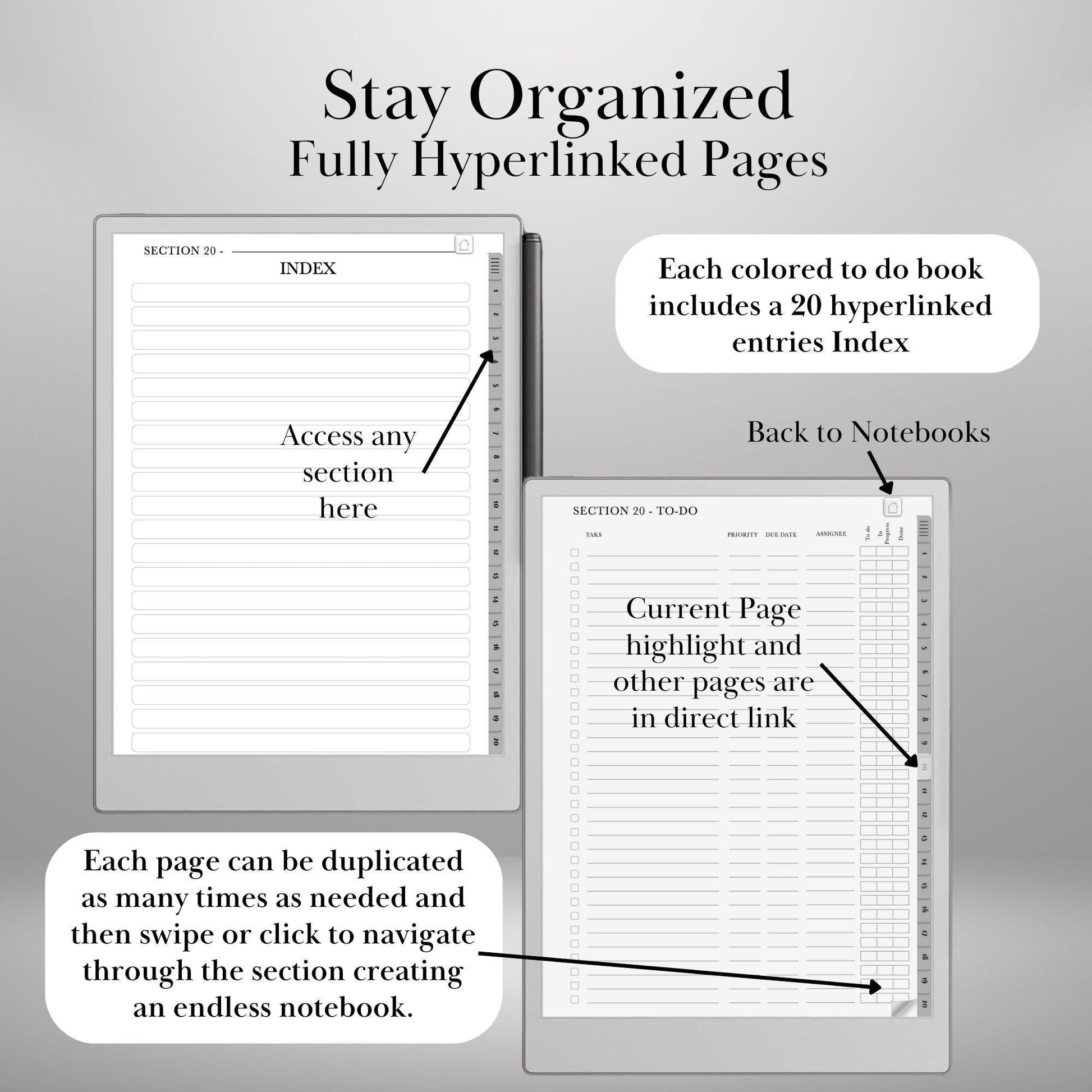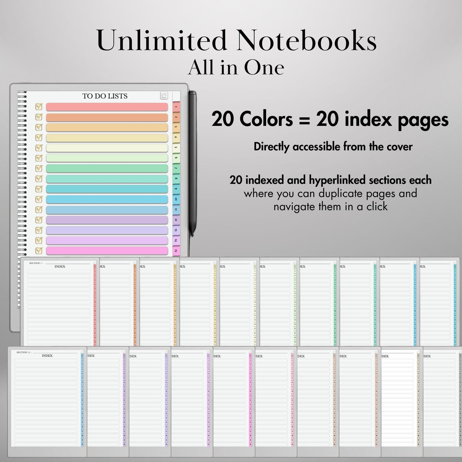 Boost your digital productivity with this fully hyperlinked, color-coded notebook bundle, designed specifically for reMarkable Paper Pro & reMarkable 2. This enhanced version includes both an infinite to-do lists notebook, helping you seamlessly organize to-dos, tasks, and projects in one place. Whether youβre a professional, student, or creative, this structured layout ensures effortless navigation, productivity, and focus in a distraction-free environment.