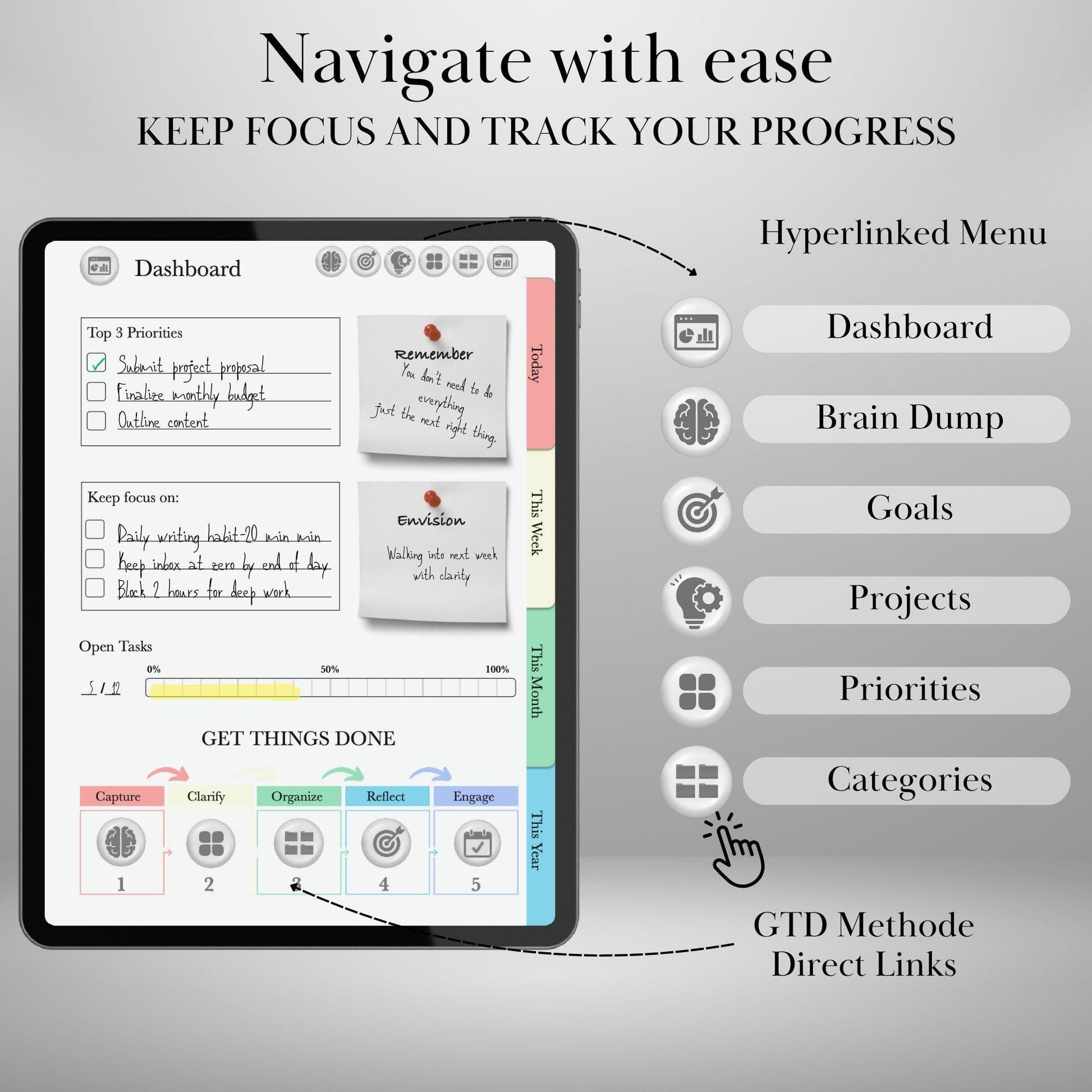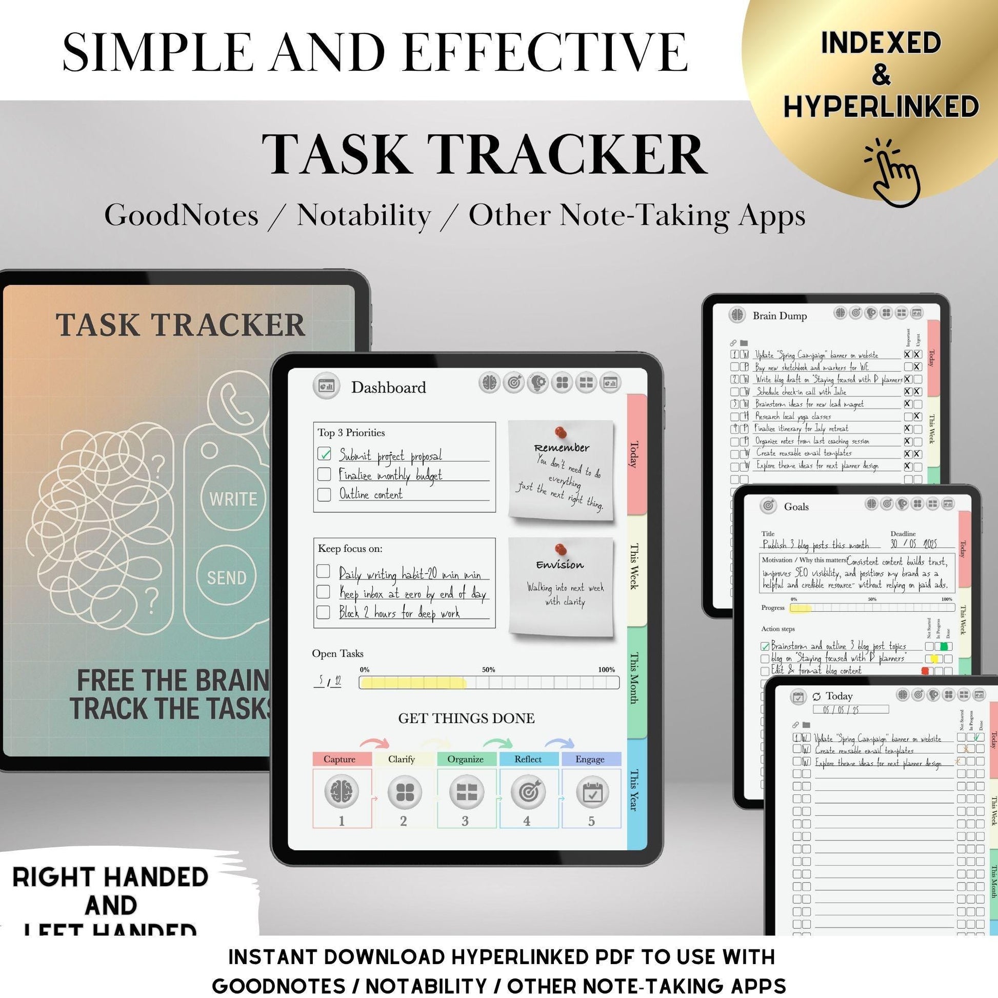 Take control of your tasks, goals, and mental clarity with this GTD (Getting Things Done)-inspired digital planner, fully hyperlinked and designed for use with iPad apps like GoodNotes, Notability, Noteshelf, or any PDF annotation tool.