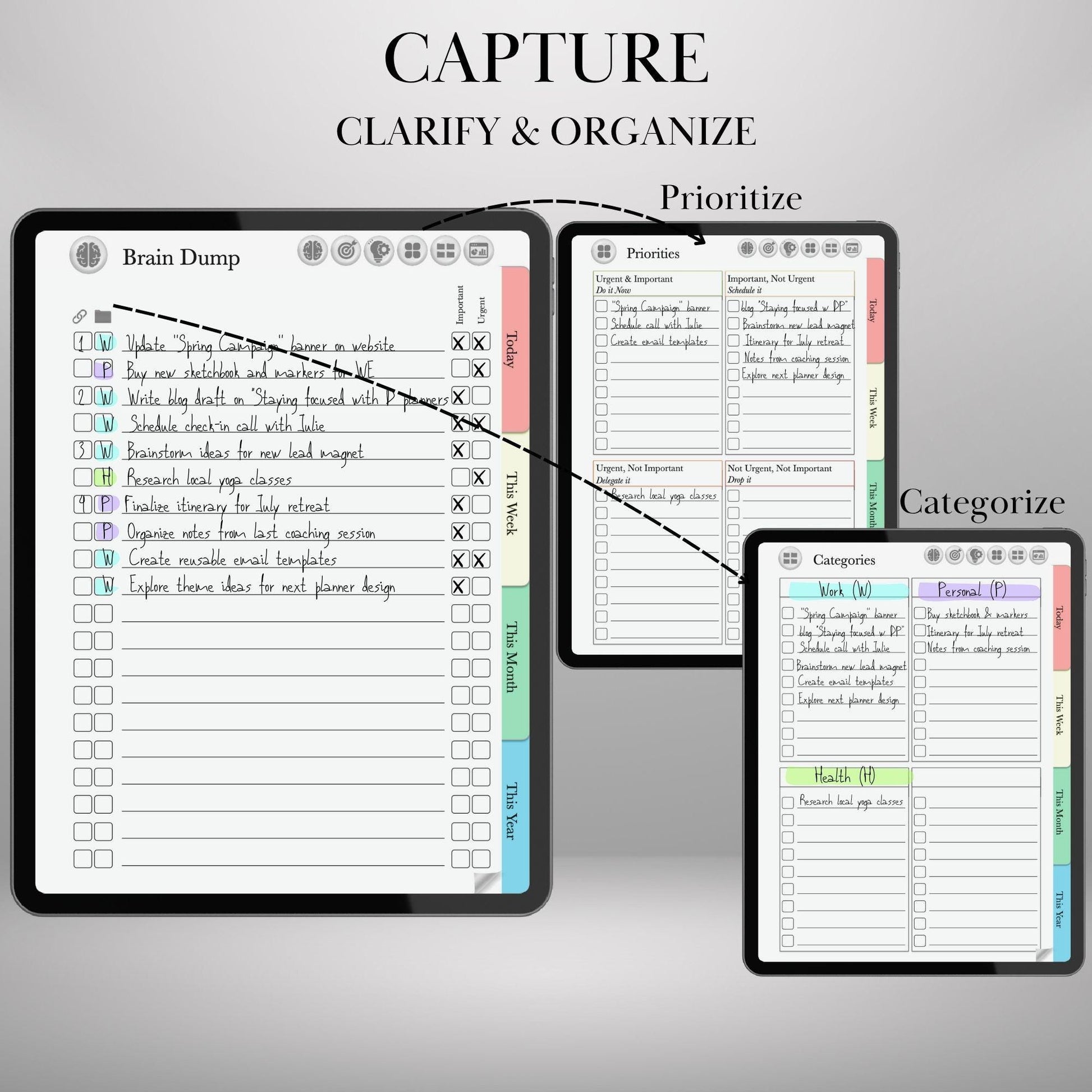 Whether you're managing big projects, organizing daily to-dos, or doing a mental reset with a brain dump, this planner gives you a clean, structured workspace to capture, prioritize, and act—without overwhelm.