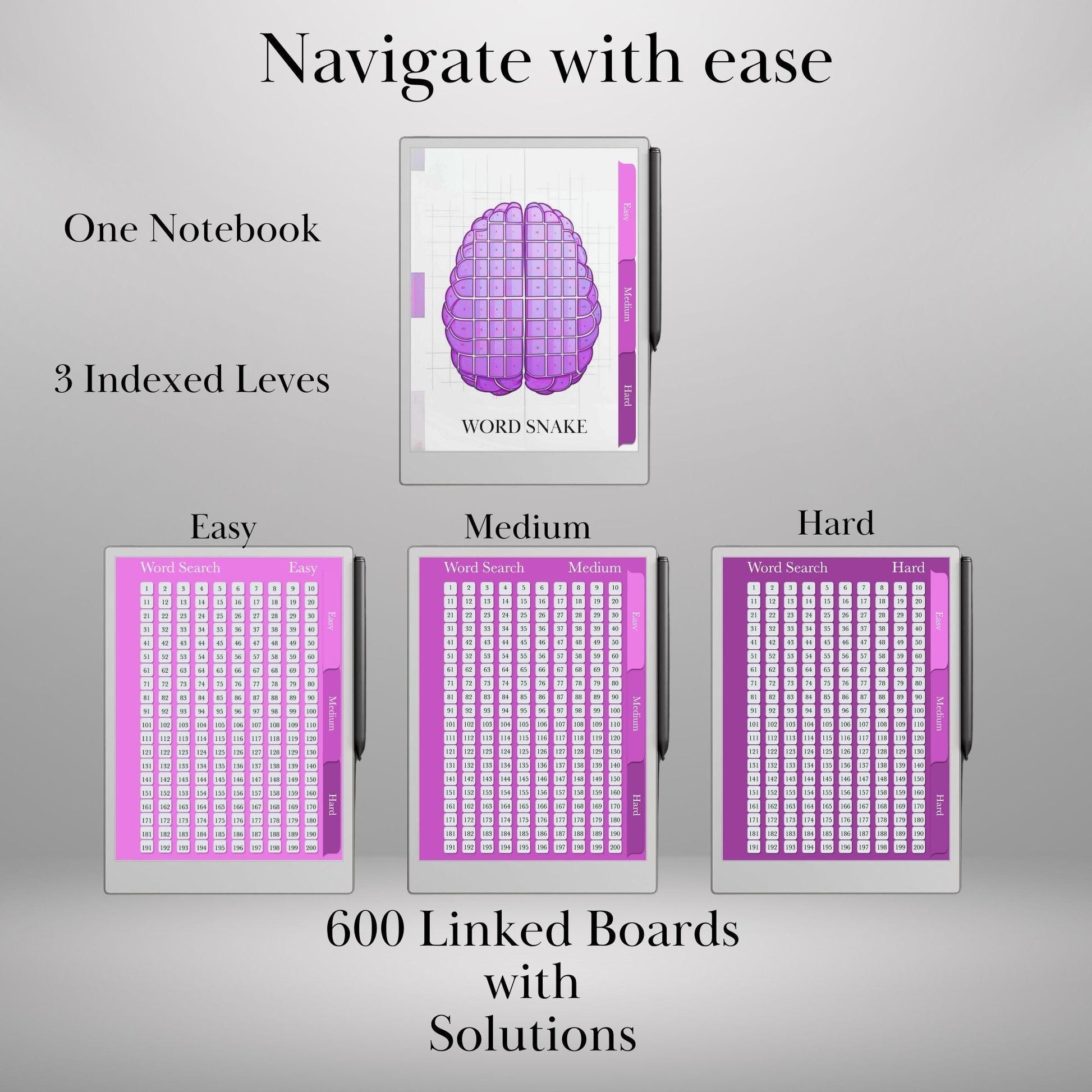 Challenge your brain with this unique Word Snake Puzzle Book, designed specifically for reMarkable Paper Pro tablets. Unlike traditional word searches, word snake puzzles weave the hidden word through connected letters in any direction—making each puzzle more fun, engaging, and mentally stimulating. With 600 themed puzzles and full hyperlink navigation, this minimalist digital game book brings hours of stylus-friendly brain training and quiet entertainment.